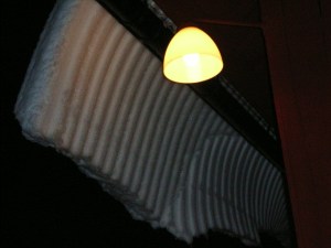 Det här är snö som ännu hänger kvar från ladugårdstaket – i morgon är den försvunnen i all snö som ligger på backen!