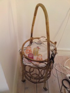 Vackra glas, några älsklingstallrikar, några bra vassa knivar och skärbrädan av en befaren planka med dekorativt hål i (hittades under segeltur nära Fredlarna i Stockholms skärgård). Skärbrädan som min älskade gjorde åt mig. Tekanna och stor mugg, bra kastruller och stekpannor/-grytor, över huvud taget bra redskap. Svärmors gamla sybord, mosters mässingsmortel och fotot på min ledsna mamma och hennes andra syster. De tavlor jag numera har kvar. Cykeln, och ett par svampkorgar, lite sänglinne, handdukar och vackra gamla dukar. Rottingvinstället på hjul, bara för att det är så knäppt. 40-talstaklampan med glasskiva som kostade 400 kr att laga. Sängen. Min Tempur-kudde.