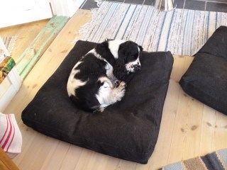 Nu är vi hemma igen, trötta allihop. Jag ska duscha, hundarna ligger uthällda på köksgolvet och halvsover. Om några timmar är det dags att gå ut igen, men på en kortare vända. (Bilden visar Louie vid en tidigare sovstund på ett annat köksgolv!)