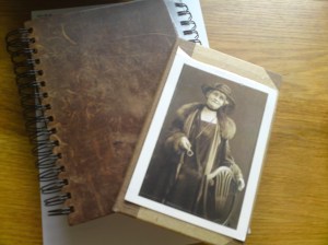 Anteckningsböckerna är blå, svarta, gula, gröna, en har Hopi-indianer på pärmen, en från 1989 hade jag bara skrivit två sidor i. På den pärmen har jag klistrat ett foto av Emmeline Pankhurst (1858-1928) från National Portrait Gallery i London, hon var en av de suffragetter som tidigt kämpade för kvinnlig rösträtt (samtidigt som hon födde fem barn under tio år). Jag gillar bilden på henne, i hatt och med förmodat svandun runt ärmar och halskrage, hållandes lornjett i ena handen. Formatet på fotot passade precis in på anteckningsboken, som är lagom stor att bära med sig. Syster min skickade kortet från besök i London.