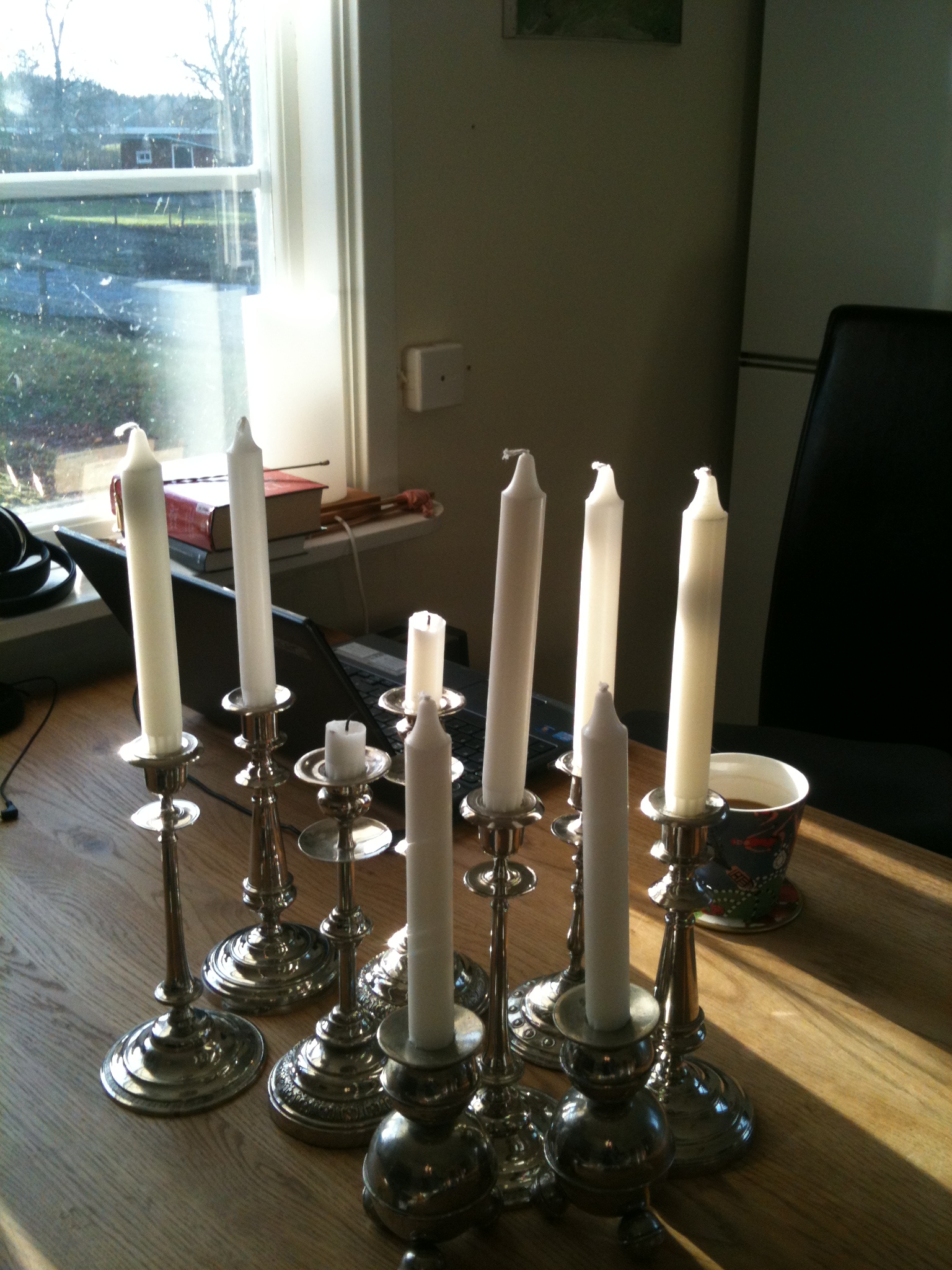 Nu står kaffet och kallnar igen, jag gör och glömmer bort. Kaffetörsten kan inte vara så stor då, eller är det något annat som fallerar? Har även letat, igen, efter den adventsstjärna som jag troligen slängde i fjol. Det blir därmed advent utan vare sig lussebullar, pepparkakor, glögg eller stjärna. Stjärna hade jag gärna haft i fönstret, resten kan jag klara mig utan. Nu får alla mina ljus i stället lysa. På köksbordet har jag nio vackra diverse gamla stakar och i fönstren står värmeljus i IKEAs utmärkta små kompakta glasstakar. Det ordet känns fel att använda för de här korpulenta glasljushållarna, men OK då. Hittar inget bättre.
