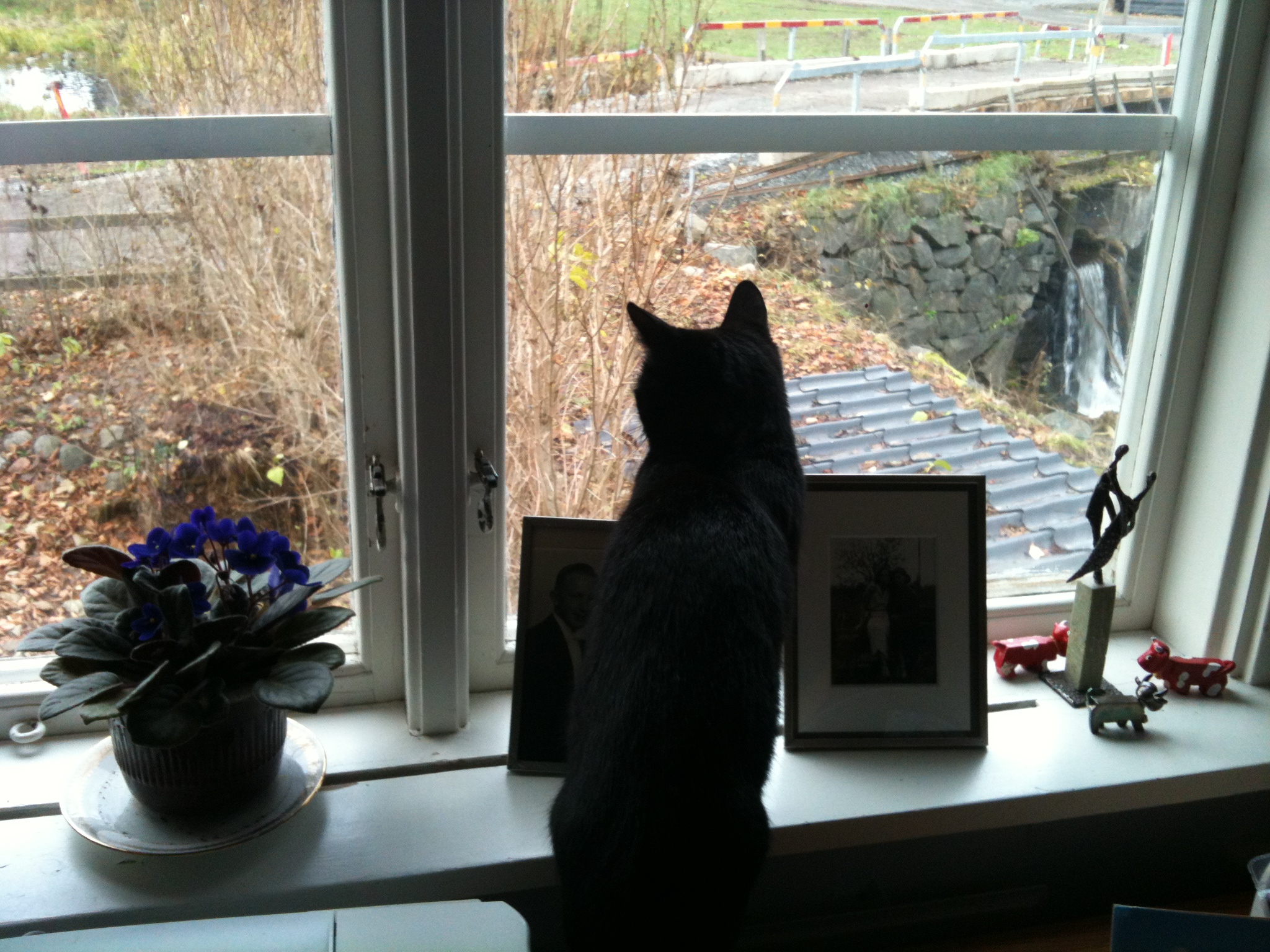Hon borde hämta in mera ved. Och dammsuga, och torka av åtminstone köksgolvet. Bädda. Hänga den där nu färdiga tvätten, och köra en maskin till. På altanstaketet sitter en liten svartmes och bröstfjädrarna fladdrar i vinden. Ser kallt ut. Himlen ljusnar, gräsmattan är grön. Och katten jagar fåglar genom det stängda fönstret.