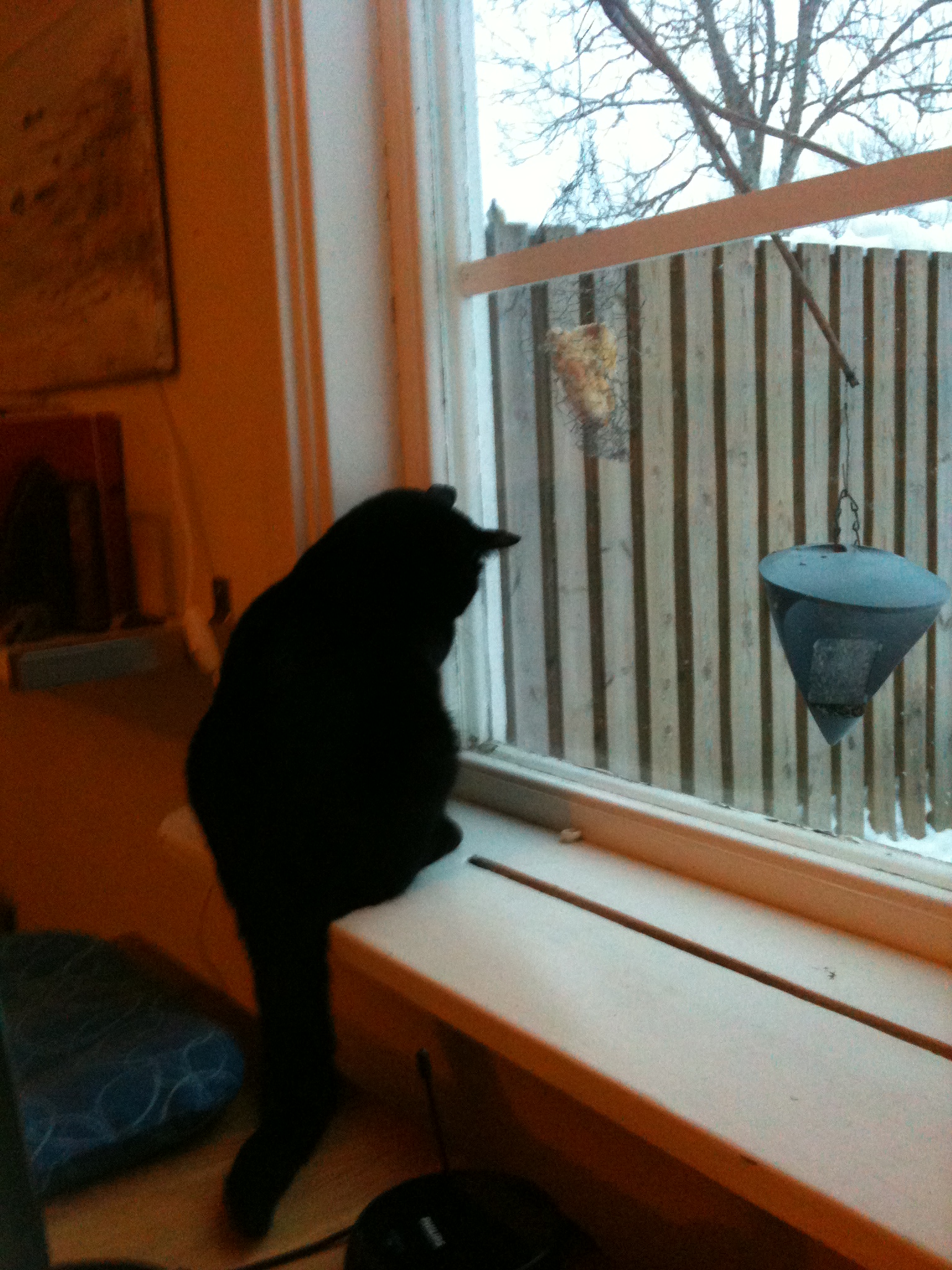 Kallt och vackert, lite snö i luften men den kommer nog mest från träden. Småfåglarna är uppburrade och runda, och tar ett frö i taget. Talgbollarna hänger där de hänger, orörda. Katten tycks ha förstått att fåglarna utanför fönstret inte är till för jakt, och vänder dem resolut ryggen.