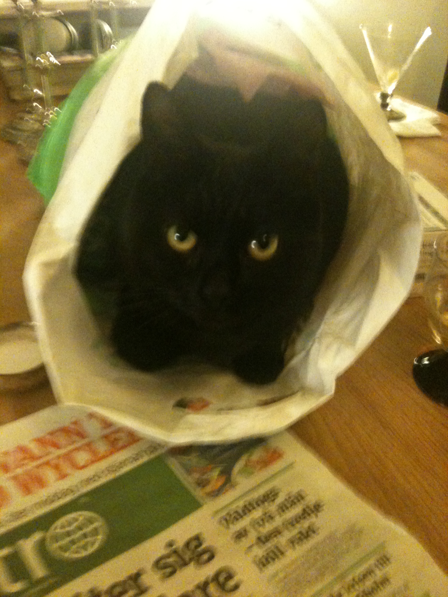 Precis som med kantarellerna är det här inte nu. Detta är Minsann inkrupen i en påse – hon gillade det. Ibland kan jag önska att jag också kunde krypa in i en påse.