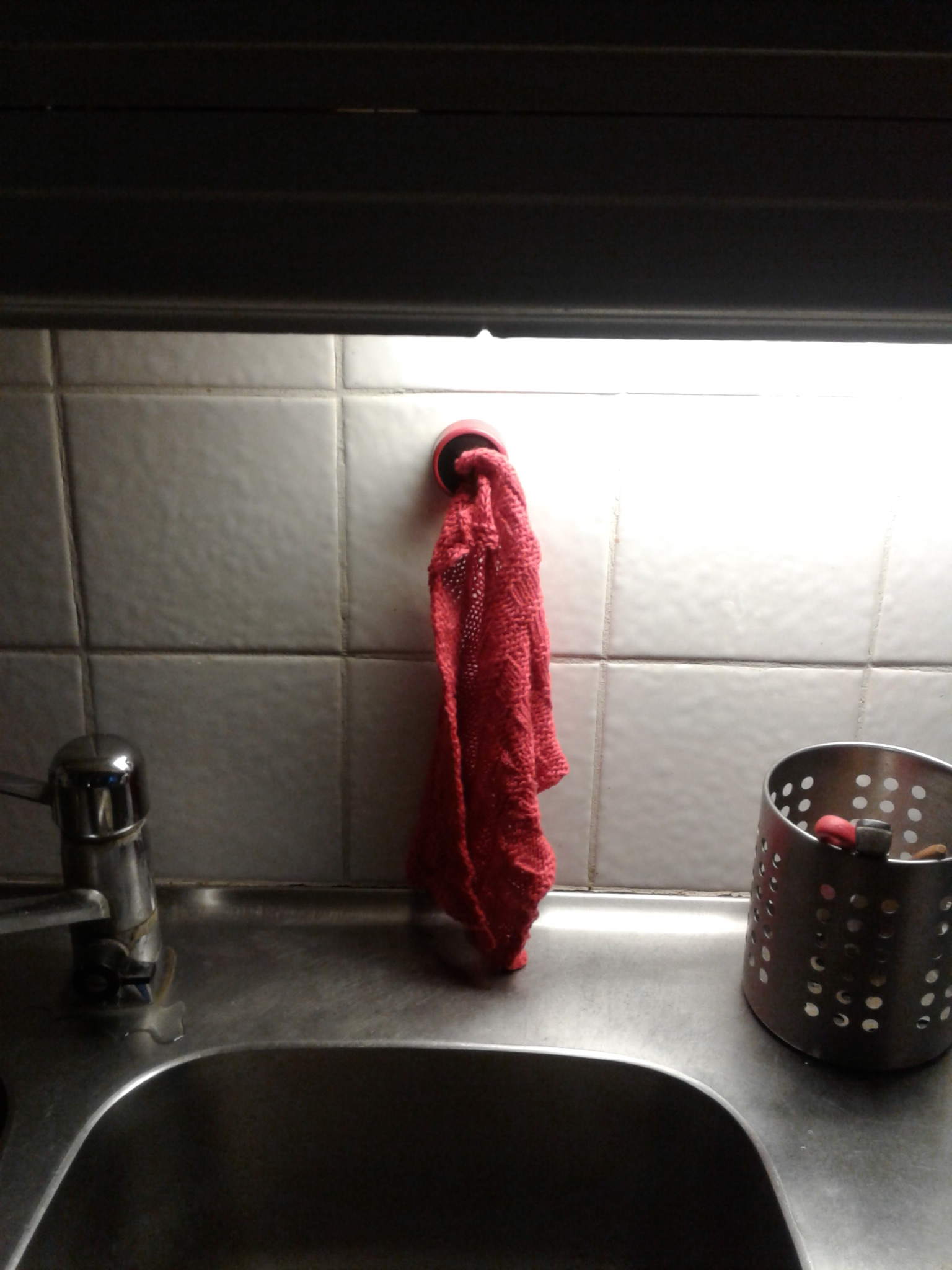Andra syrran ringer. Det är så himla gott att ha de här två som jag kan grina med och prata med och bli förbannad på ibland. Men ändå veta att de finns där, och att de känner Jan och älskar honom, de också. De är med oss. Yngsta syrran har dessutom skickat en disktrasa i väldigt naturlig julröd bomull som inte färgar. Hon har stickat den, terapistickat. Fint, nu har jag slängt ut Wettex-dukarna. En gång trodde jag att jag ville ha en disktrasa av lin, nu har jag fått denna i stället. Tack kära syster.