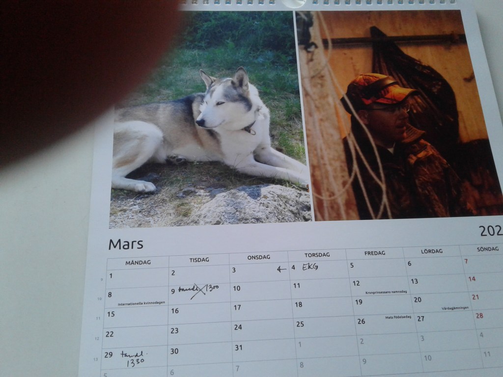 Tidig middag. Ensam, tyst i huset, det enda som rör sig är fåglarna som hämtar solrosfrön. Och mina fingrar när jag ibland skriver några ord. Inte för att jag har något viktigt att säga, bara för att jag inte har något bättre för mig. Lottas, sonhustru, almanacka med bilder från våra liv, som Jan skulle få till jul finns inom synhåll. Den kanske skulle hjälpa honom att minnas. Nu, i mars, ser jag Mats hund Rösti och Mats själv, hans födelsedag är 26 mars. Att se dem gör mig både glad och ledsen. Och jag är så innerligt tacksam för Lottas omtanke att göra den här almanackan. Nu fick jag den i stället för Jan.
