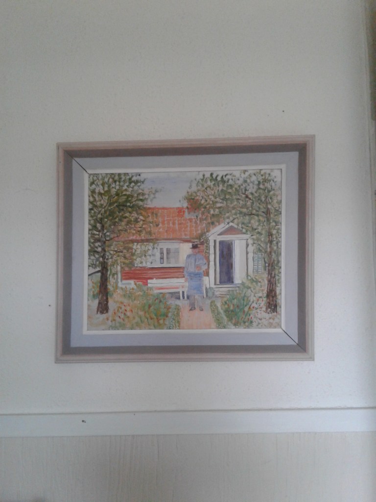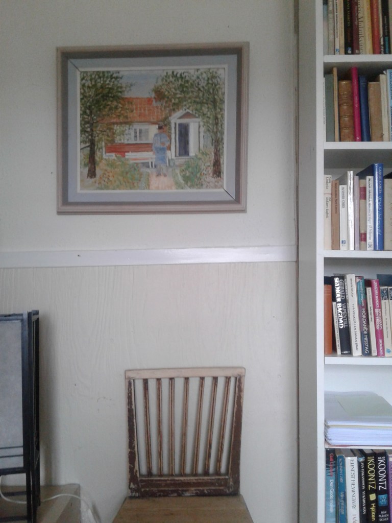 Ska flytta en byrå från mitt sovrum till gången in till duschrummet. Lådorna går bra, men själva byrån är tung och ska fram där det egentligen är för trångt… Nåja, jag brukar fixa sådant, en trasmatta under till exempel och så dra i stället för att lyfta. En timme senare står byrån på rätt plats, jag har packat linneskåpet fullt, och byrån med. Det gick lättare än jag trodde, morfars stol står nu där byrån stått, och tavlan som jag självsvåldigt förknippar med honom står än så länge på stolen. Väggarna här är besvärliga, hårda och svåra att spika i. Men även det gick till slut, när jag tog en vanlig inte alltför lång spik i stället för tavelkrok. Nu hänger tavlan där den ska. Och jag ser den bland det första jag ser när jag öppnar ögonen om morgnarna. Det är bra.
