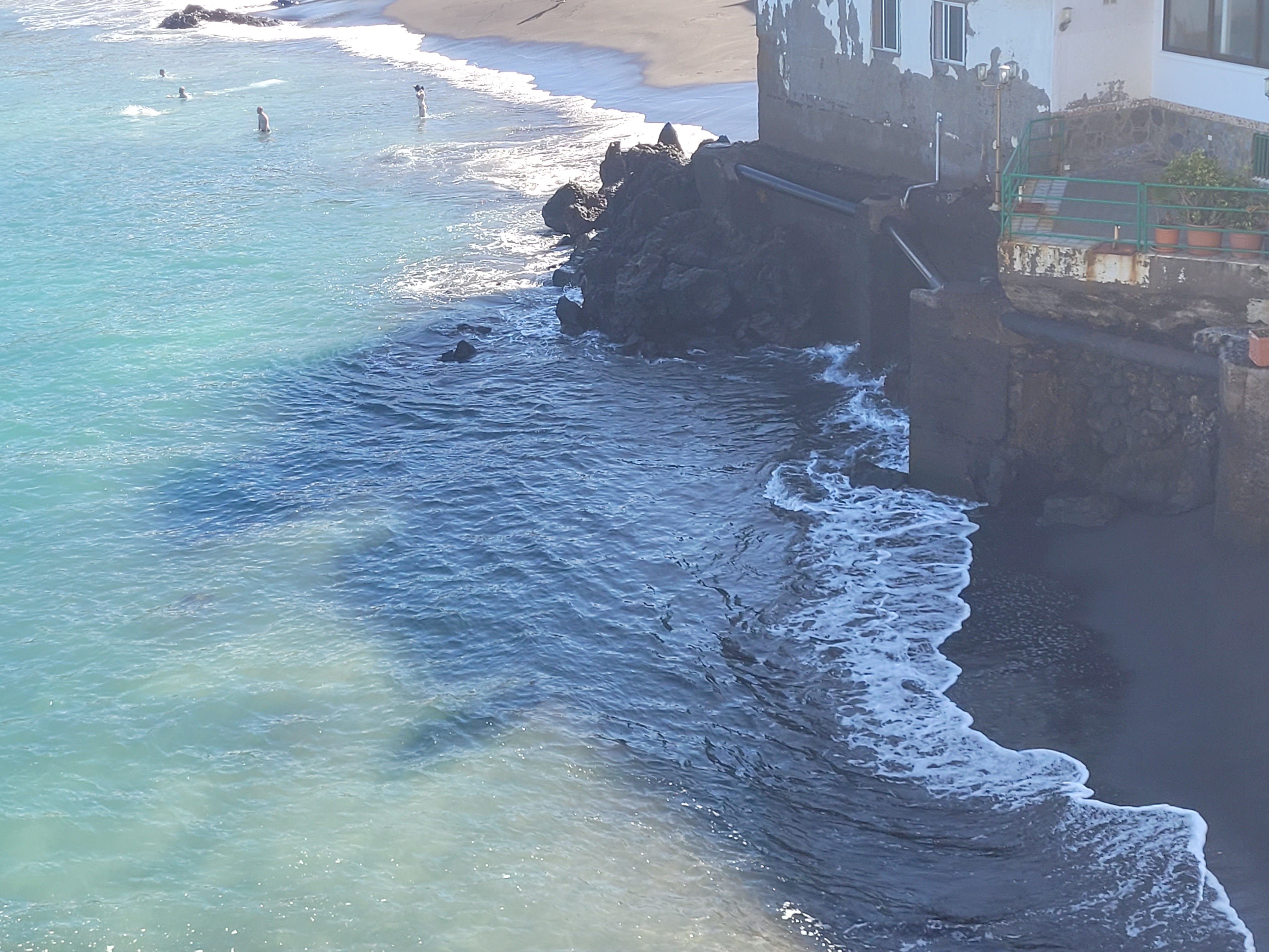 Söndag 19 december 2021 – Isaac och jag promenerar bort till en Mercado, handlar frukt, ost, grönsaker. Går lugnt och sakta tillbaka i solen, till baren vid stranden. Idag får ingen simma där, röd flagg och stora, starka vågor. Vi drack varsin kaffe bonbon och gick hem.