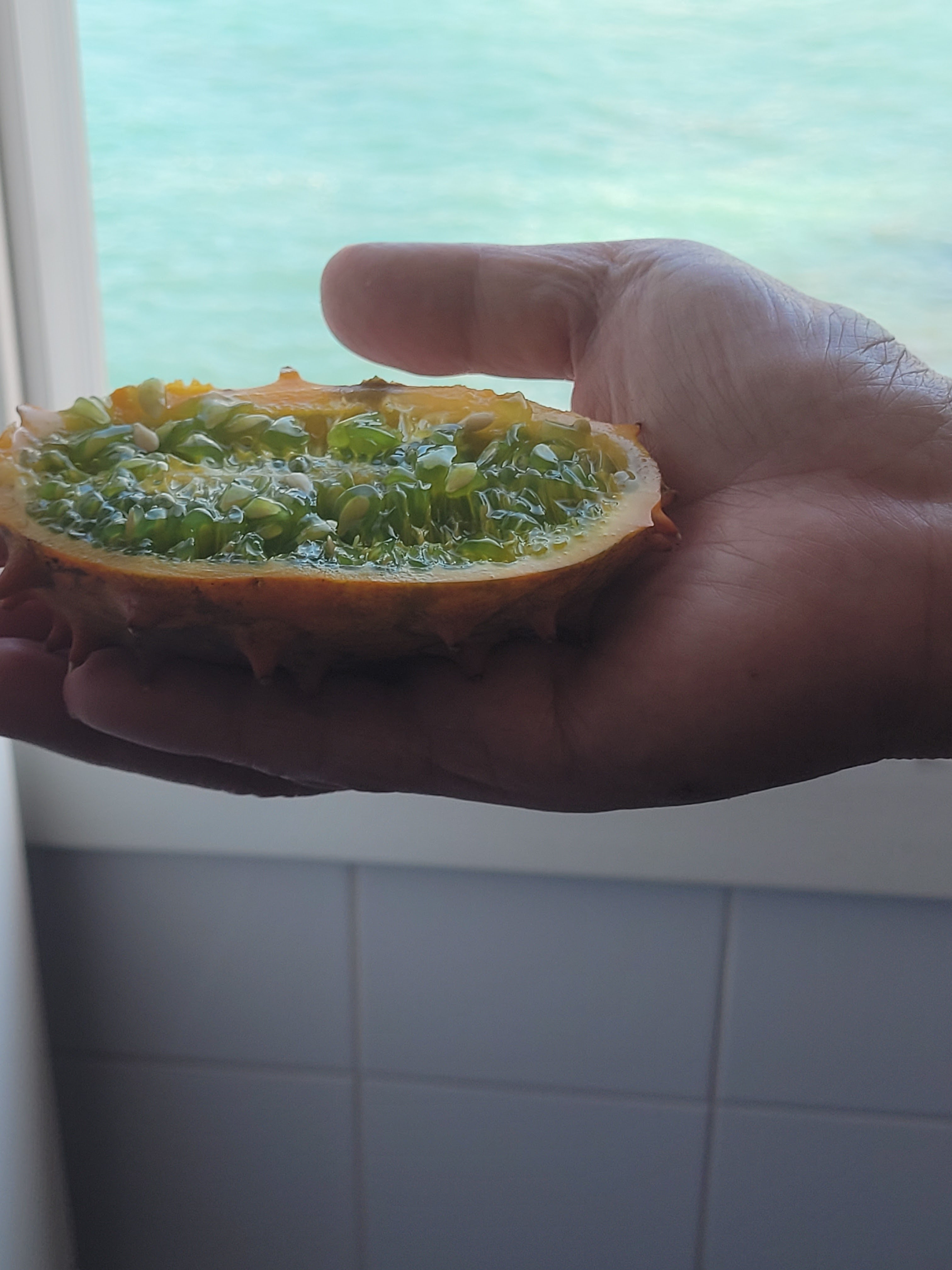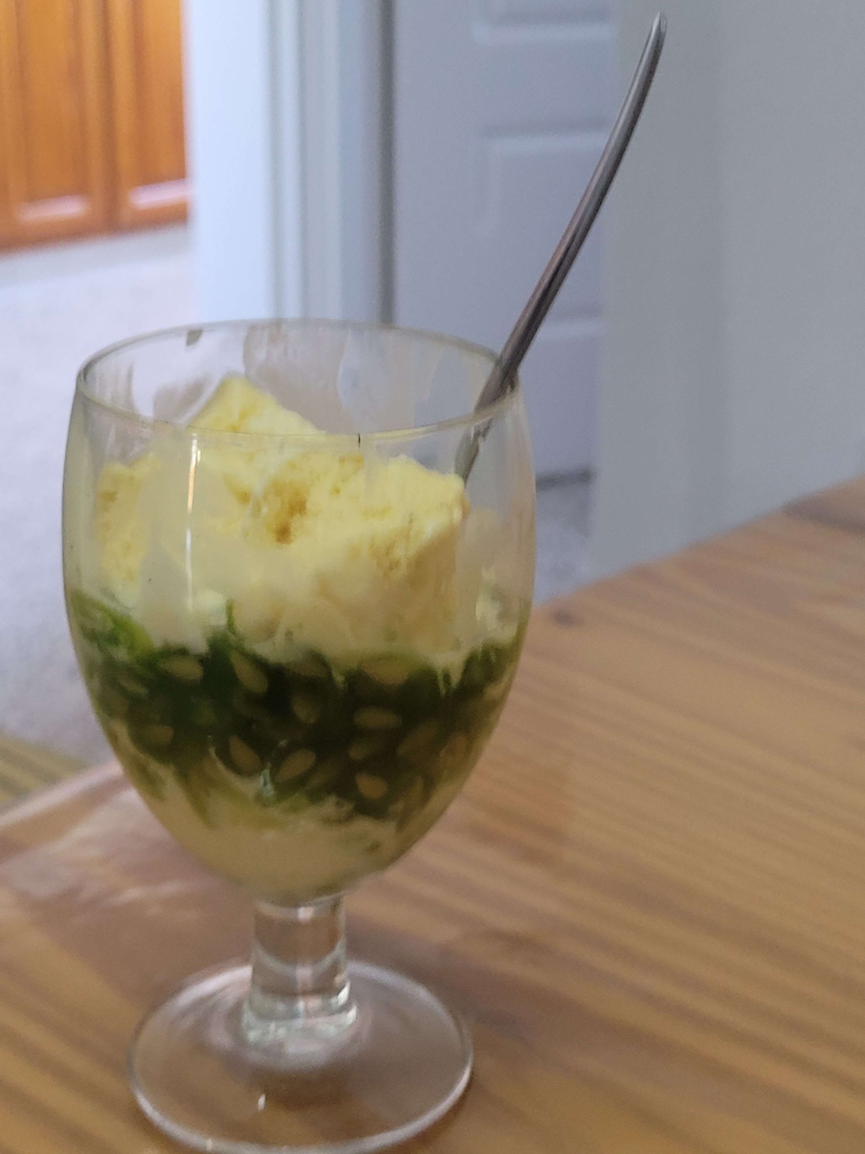 Isaac lagade en mycket god grön curry, med citrongräs, dito löv, lök, purjo, vitlök, kryddor, kokosmjölk, ostronskivling, champinjoner, tunt skivad morot, så himla gott. Ganska starkt (chilli paste), men inte för starkt. Ris och kikärter till. Pappadum. Efterrätt i vinglas, vaniljglass med den kenyanska taggiga melonen (som inte liknar någon melon jag hittills sett), med gröna kärnor som är mycket ätbara. Ingen stark och påtaglig smak, men vitaminrika. Jag får fantastiska måltider, mitt eget matlagande kommer att verka och smaka ”bland” efter detta.