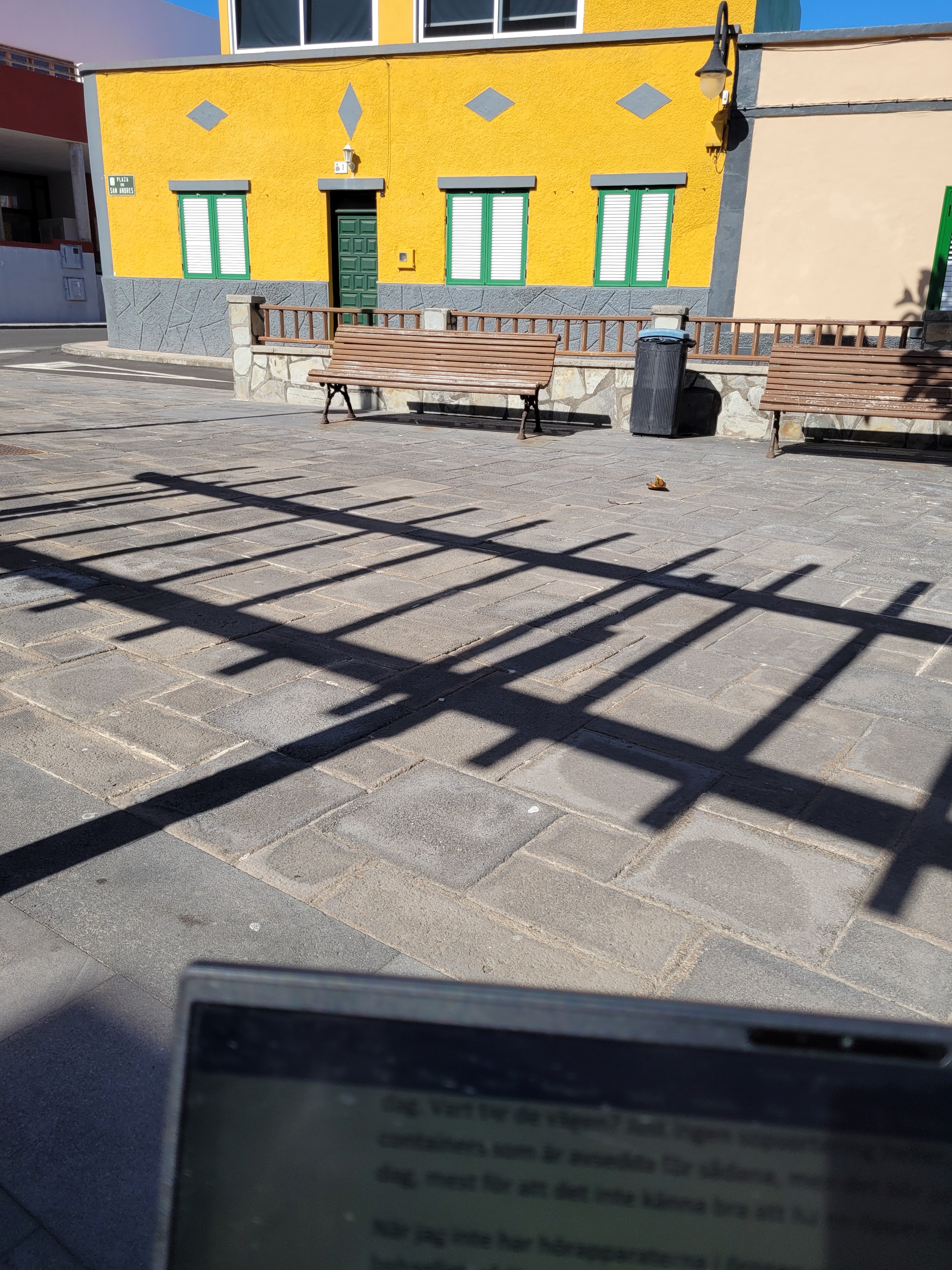 Är nu på min Plaza de san Andres igen, satt i solen en stund, men mäktar inte. Nu lär det alltså ungefärligen vara low tide, och ändå är vågorna så stora och ser så starka ut. Ingen fiskare idag, men en mås som höll uppsikt. Inga katter heller här vad jag ser, men jag hör den där hunden (?) som låter väldigt konstigt, kanske är det en hes duva? Har inga hörapparater i öronen. Nyss föll ett visset stort löv mycket snabbt en bit ner i fikusen – det såg nästan ut som om det var ett djur som klättrade neråt mycket fort. Lövet fastnade på vägen.