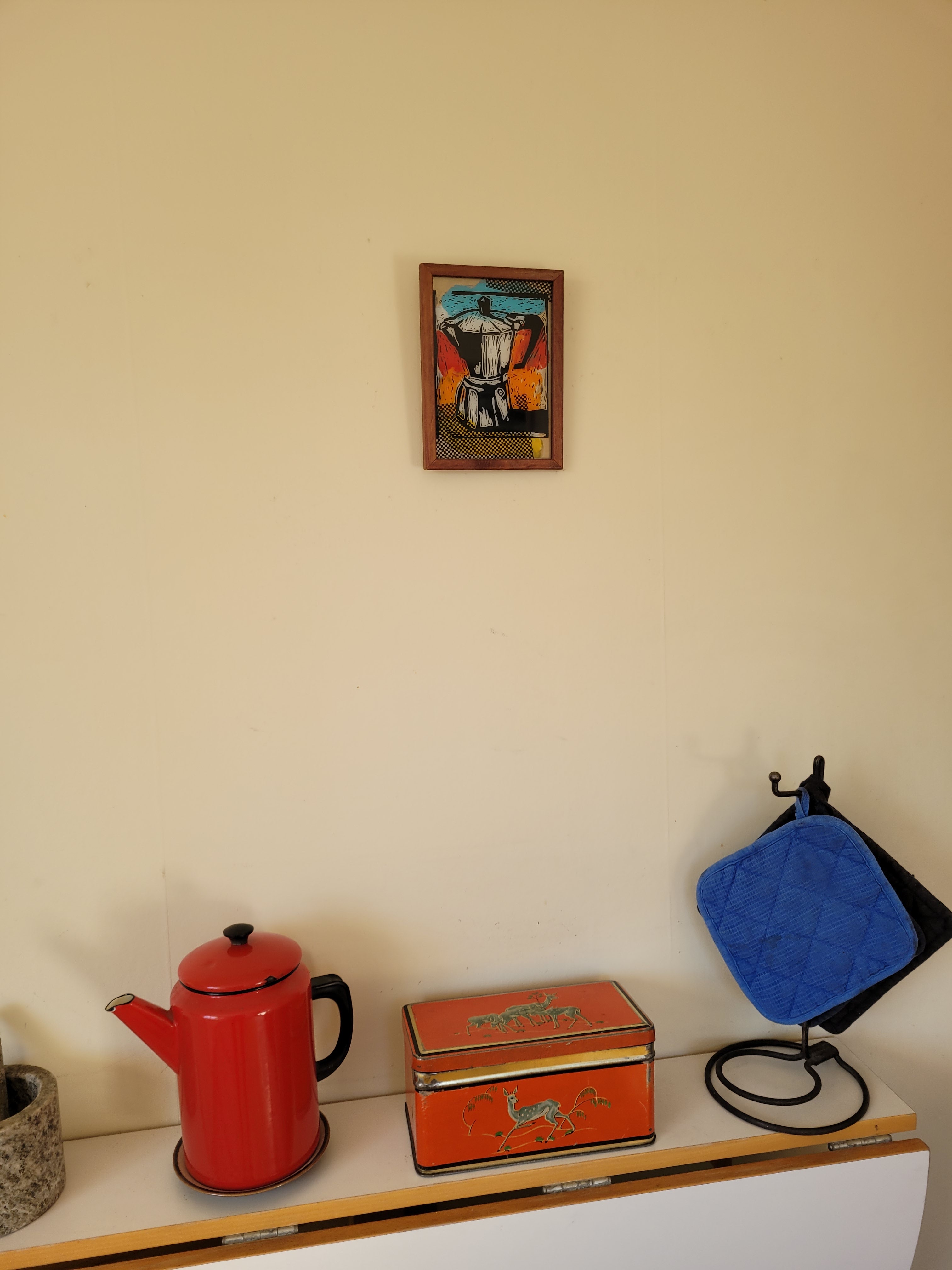 En tavla med kaffekokare och orange bakgrund, skapare Philippe Auriol, Paris; en röd kaffepanna från Kockums, numera för blomvatten och mosters kak-/brödburk med rådjur som dansar i en röd skog? Mortel t.v. och grytlappar t.h. på en ställning för spisringar – allt utom tavlan på ett uppfällbart bord från Ikea för länge sedan.