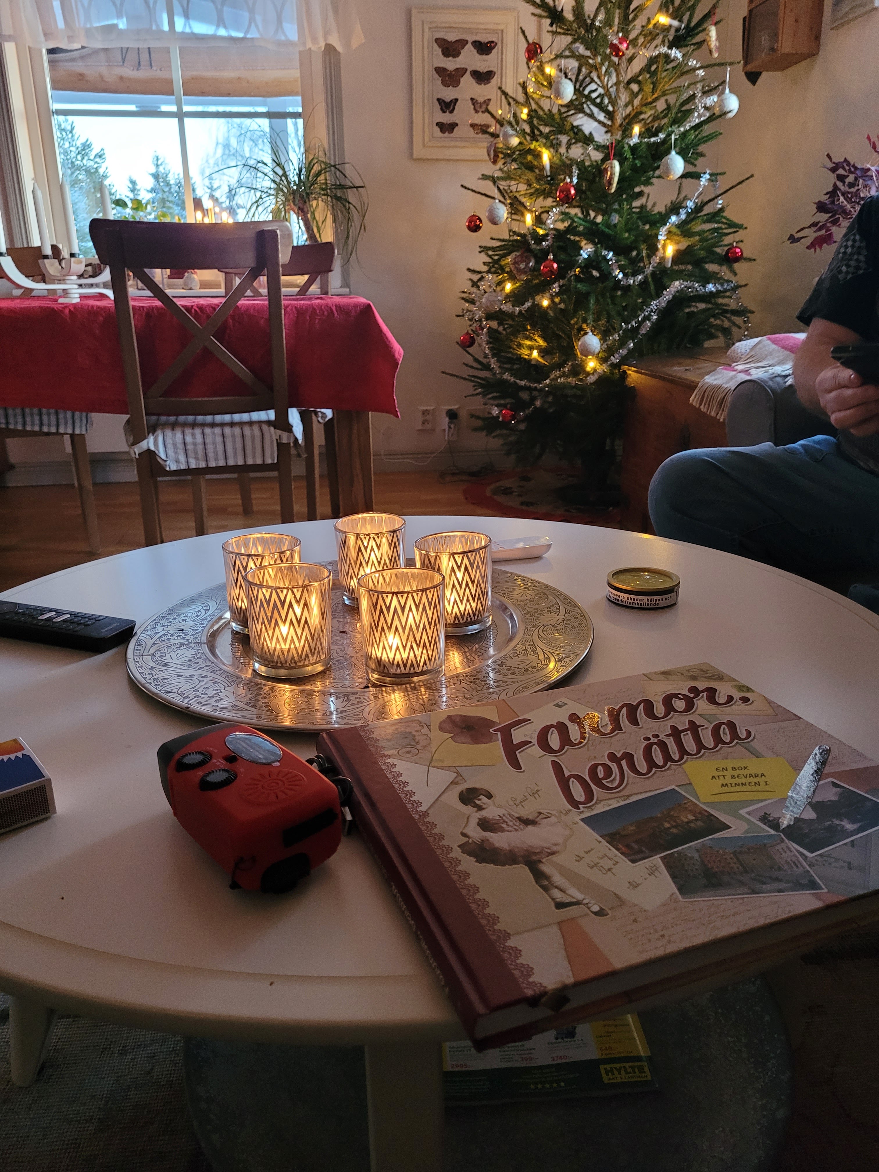 Fick en ”farmor berätta-bok” av sonhustrun. Om den får plats i bagaget får den följa med till JLP. Flinar lite åt vissa ”startmeningar” – men det kanske kan få igång mig med den släktkrönika sonen beställt. Han påminde mig igår.
