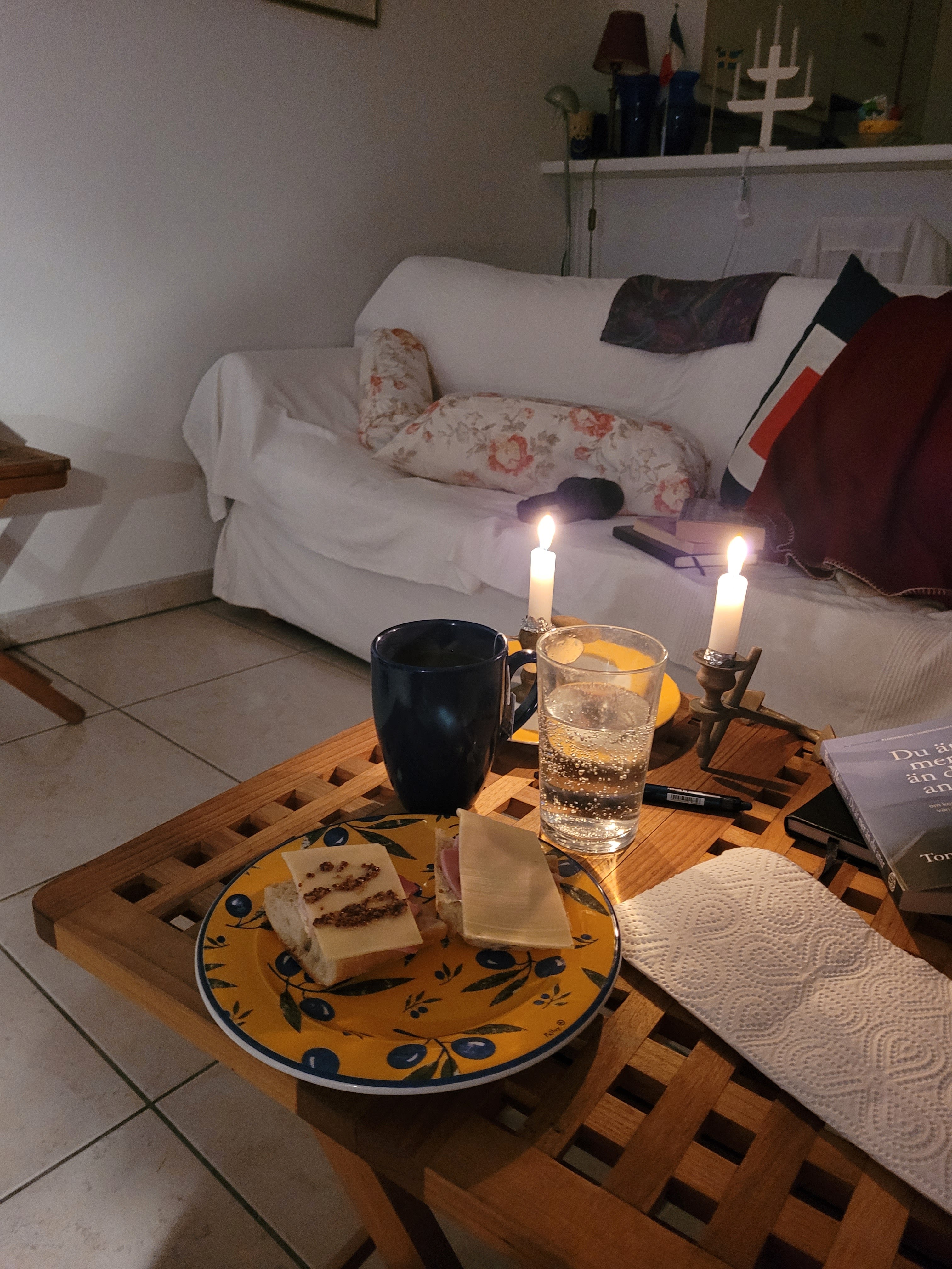 Frukost tidig morgon den 7 januari 2023, skinka, ost och Maille-senap på baguette, te och vatten till.