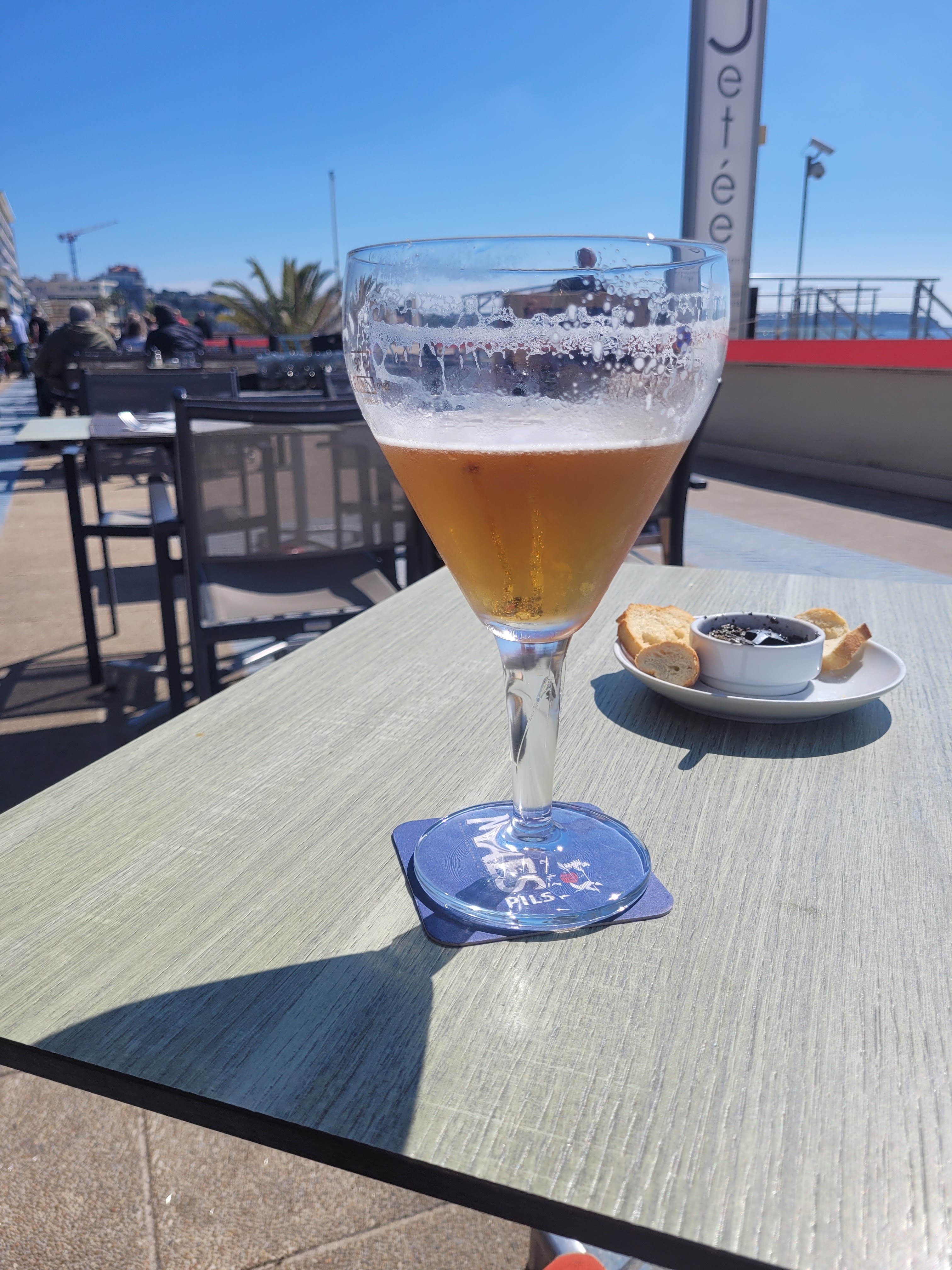 Har tagit min promenad (4 000 steg), druckit den största och dyraste öl som fått plats i ett glas. Kom hem utan problem, köpte en tarte au poire på vägen, plus pain tradition. Nu hemma på balkongen i ljuvlig sol.