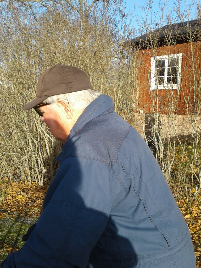 Den ena är en tom sko, den som kom hem med bud när mannen varit på sjukhus. Skon visade sig innehålla hans saknade klocka. Samma sko kom inte hem, när han avlidit på nästa sjukhus, klockan hade då fått stanna hemma och han behövde ingen sko. En annan bild där han går med sin rullator ut genom grindhålet vid mitt hus i Roslagen, trött på att höra mitt tjat om att gå en liten sväng.