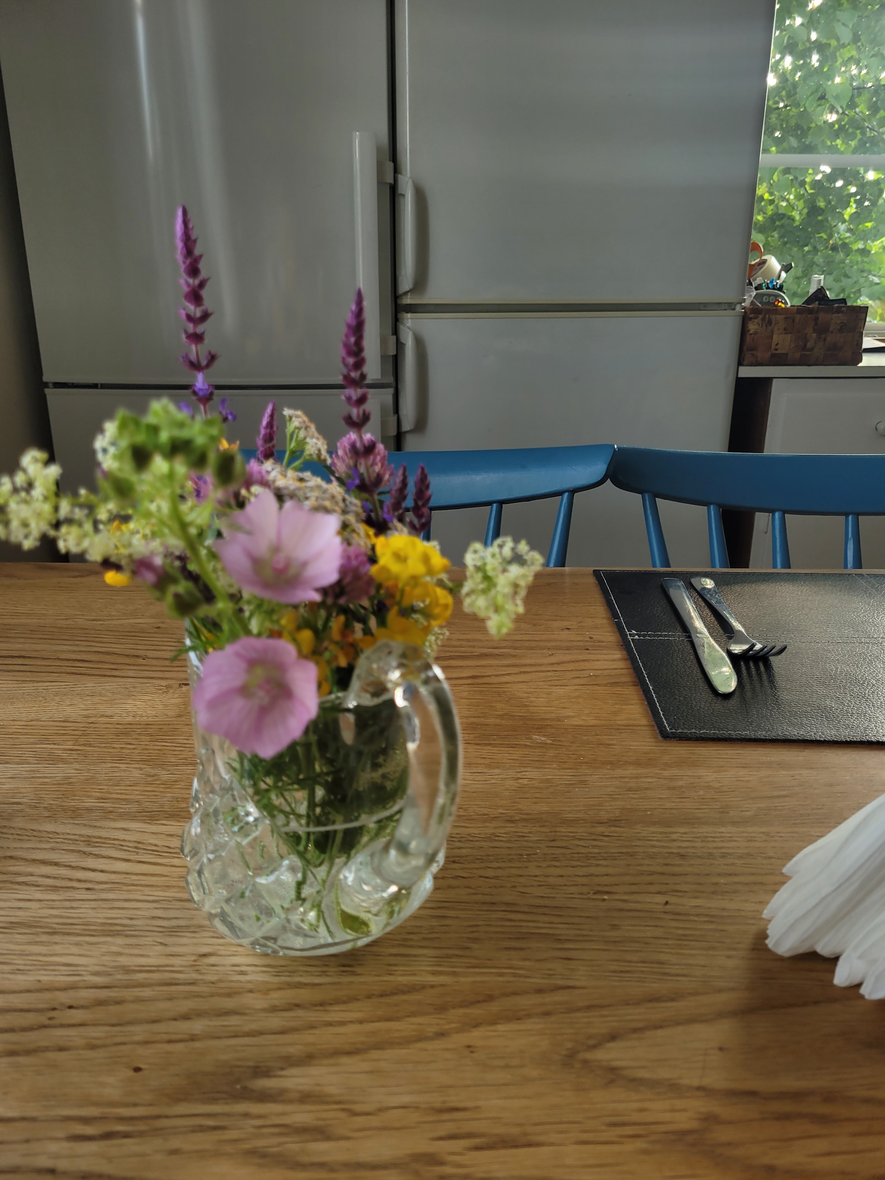 3 juli 2023 – måndag, regn under natten, för blött på altanen. Tidig frukost, försök med ultrasvårt sudoku, går inte. Klockan åtta är jag färdig med mitt kallnade te. Har vikt tvätten som torkat inne under natten. Sover och ligger vaken några timmar, trots svalare temperatur och öppet fönster. Nu blåser det och har börjat regna lätt. Har lärt mig att den rosa vackra blomman i min midsommarbukett (och nu) är en rosenmalva. En enda liten planta har valt att slå sig ner vid det gamla staketet vid den oanvända före detta tennisplanen, på väg ner till badhuset.