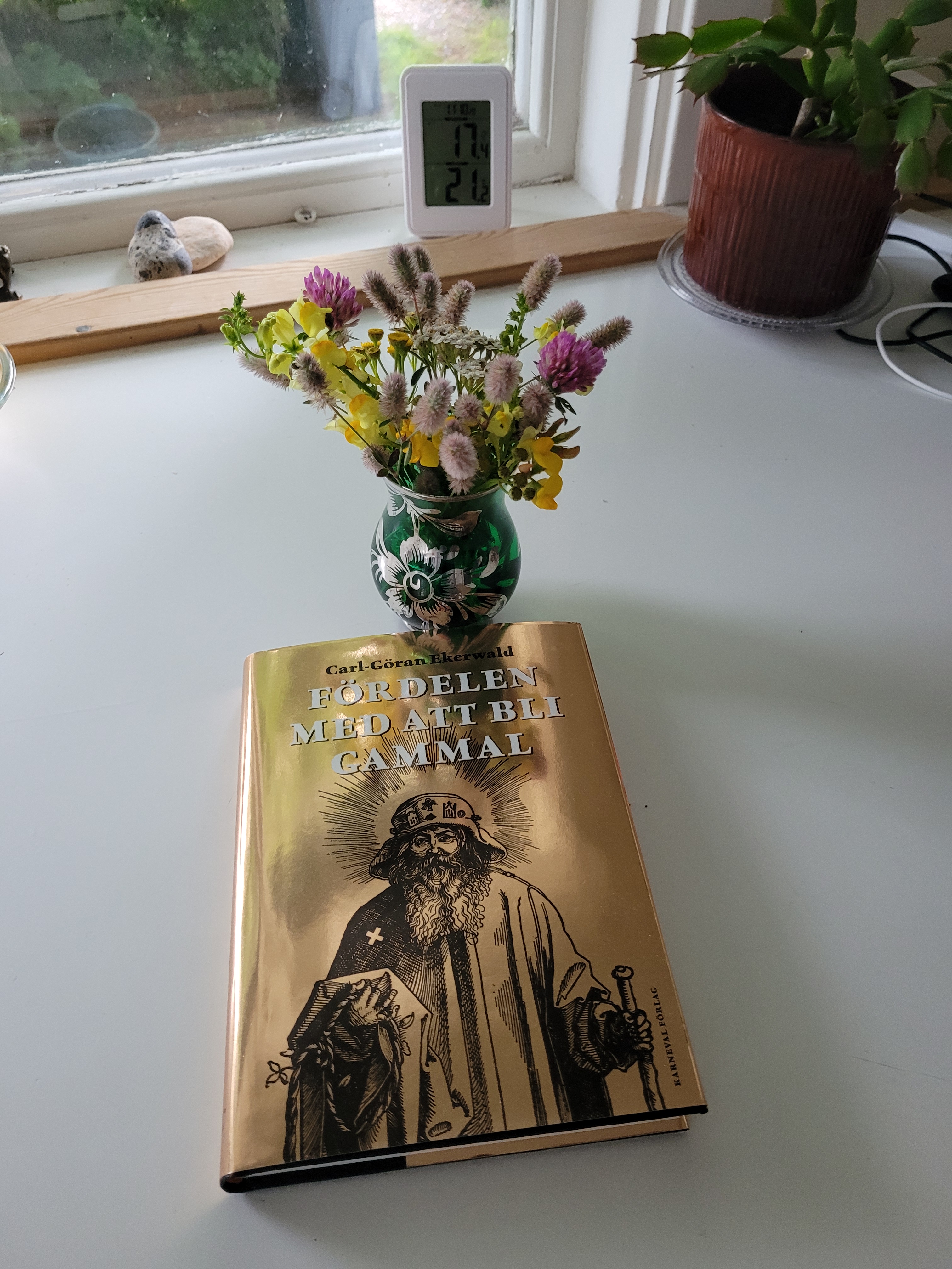 Lördag, 22 juli 2023. Bad tidigt, kändes kyligt i vinden, var skönt. Plockade några blommor att sätta i min nyputsade gröna glasvas. Någon sorts lejongap, käringtand, rödklöver, haröron, rölleka och renfana. Dagen har tillbringats på altanen, i skugga, läsande. Nu behöver jag hitta andra böcker att läsa. Vädret har varierat, moln ibland, sol mest, vind. Och getingar som surrat runt mig. Gillar inte sådana.