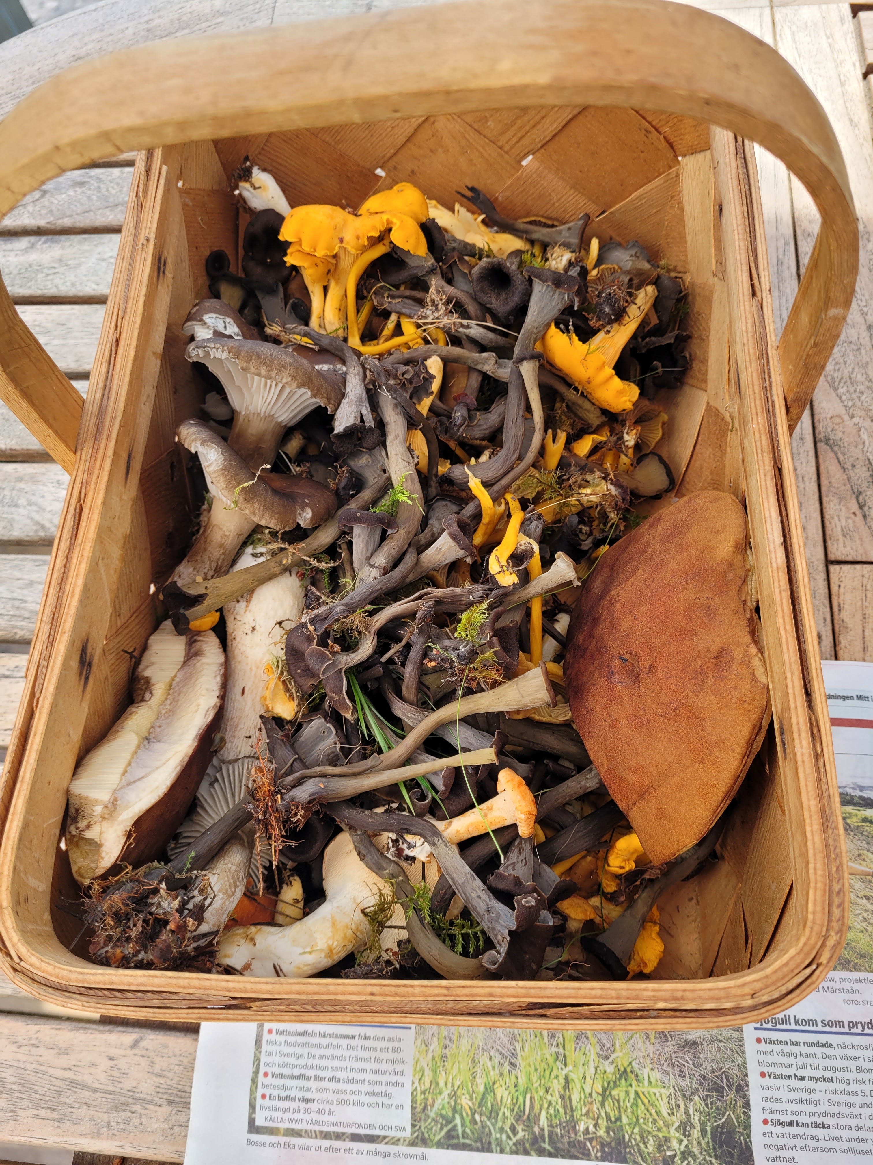 Åkte när jag hängt tvätten. Plockade bara in det som skulle in i kylen, sen ut i skogen. Och plockade svamp – kantareller, svart trumpet, svart skivling som jag glömt vad den heter, trattisar och ett par fina soppar. Glad att jag tog mig hem, trött i hela kroppen. Men benen höll. Nu har jag rensat och förvällt kantareller och diverse, trattisar och trumpeter får torka så gott de kan här på tidningar ute på altanen över natten, och fortsätta hemma. Åker hem i morgon. Sitter ute i skön halvskugga. Tänker inte gå in förrän jag fryser. Eller tror att jag måste äta middag.