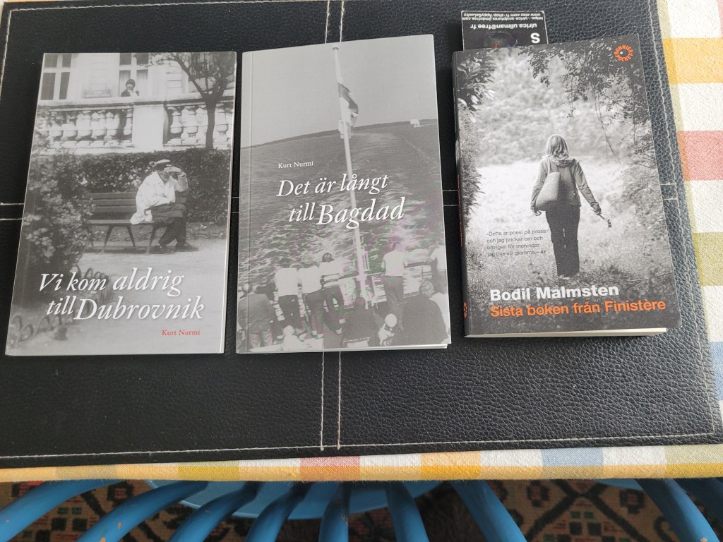 Har just läst ut Kurt Nurmis bok Det är långt till Bagdad, och läser parallellt Bodil Malmstens Sista boken från Finistère. Två väldigt olika böcker, men ändå på något sätt lika. Korta texter, Kurts bok ger läsaren minnesbilder från det förflutna och funderingar över det nutida livet; Bodils ser framåt fast hon inte vill, trots att hon måste lämna Finistère som hon älskar. Och inte kan hon skriva erotiskt heller…