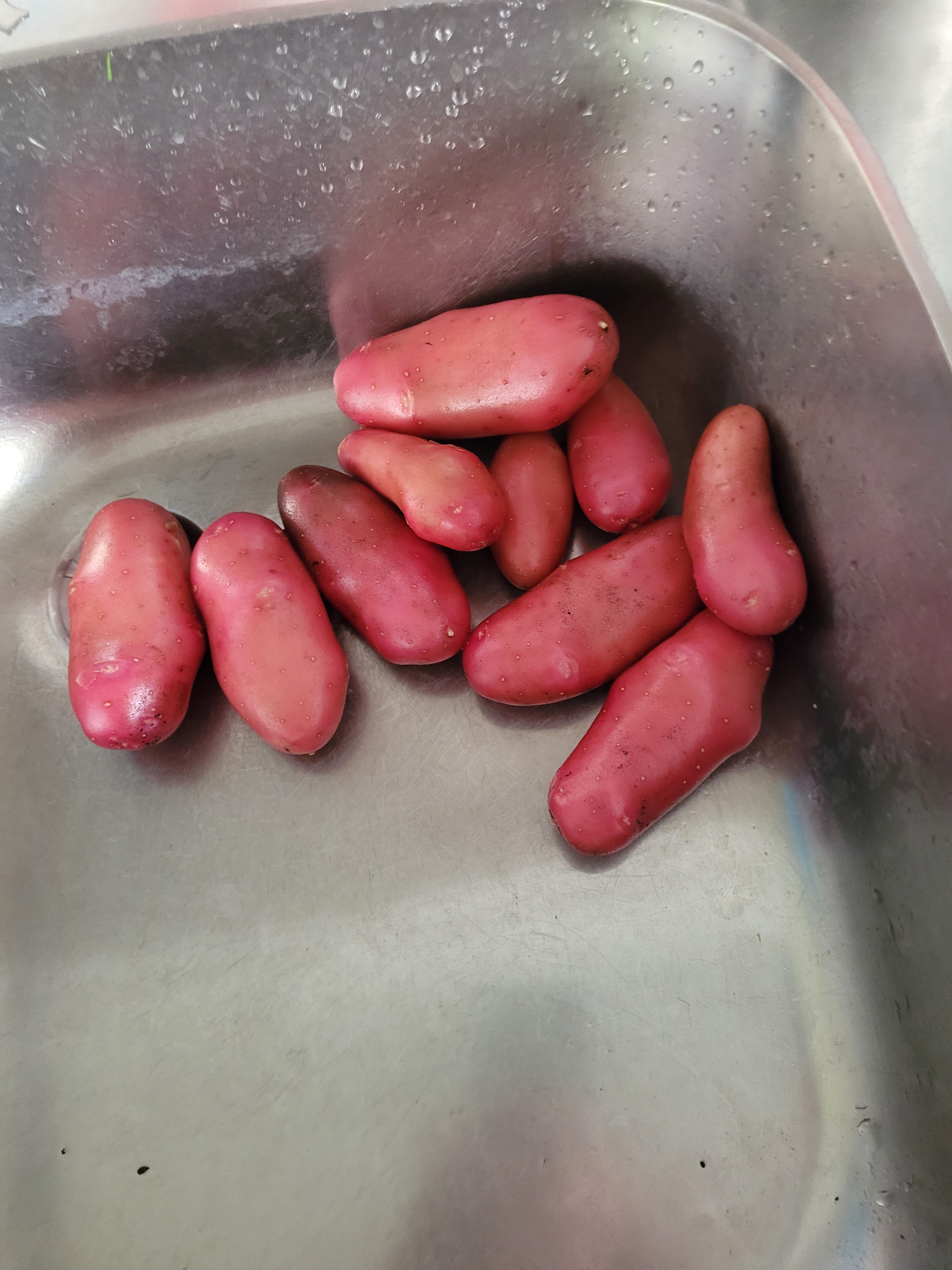 Måndag – in till Norrtälje för vaccinering, ”har du inte fått meddelande om att boka om tiden?” – svar ”nej”. Trots något som inte fungerat som det skulle, igen, fick jag min vaccinering. Åkte hem och lärde mig av Karin att all potatis inte blommar. Där kunde jag gått och väntat… Nu vågade jag kolla – och härliga fina röda potatisar under de tre stånd jag tog upp. Nu ska vi äta nyskördad potatis till kycklingresterna från häromsistens (förvarade i frysen). Hoppas potatisarna är goda och inte enbart vackert röda.