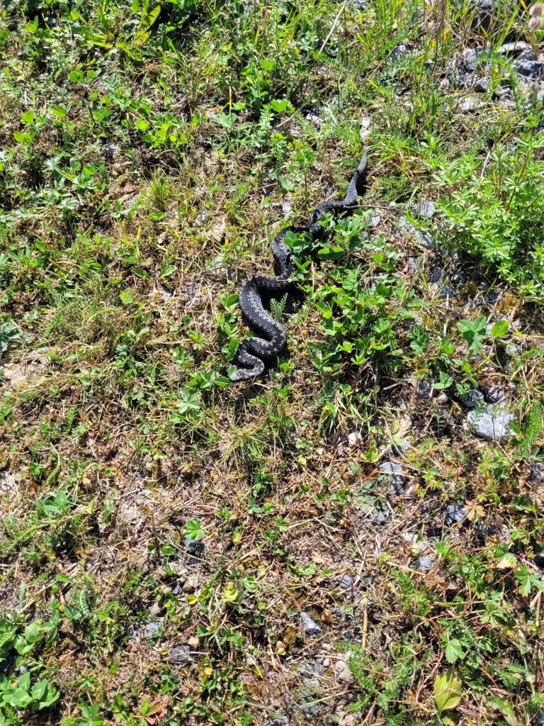 När jag var ner till sjön i förmiddags träffade jag en slank liten huggorm, som stelnade mitt i en rörelse när jag kom. Huvudet alert höjt, resten absolut stilla. Jag tog en bild.