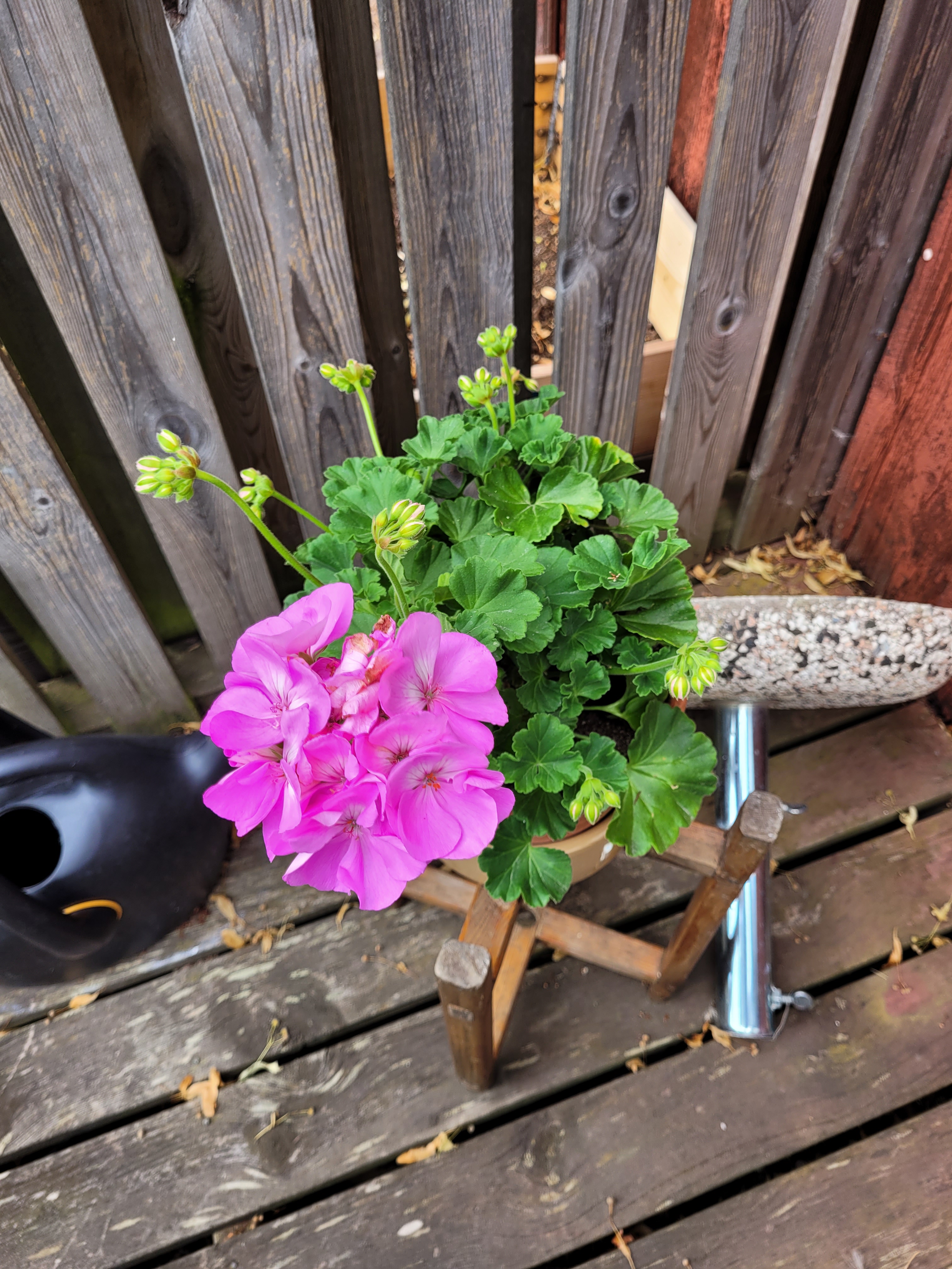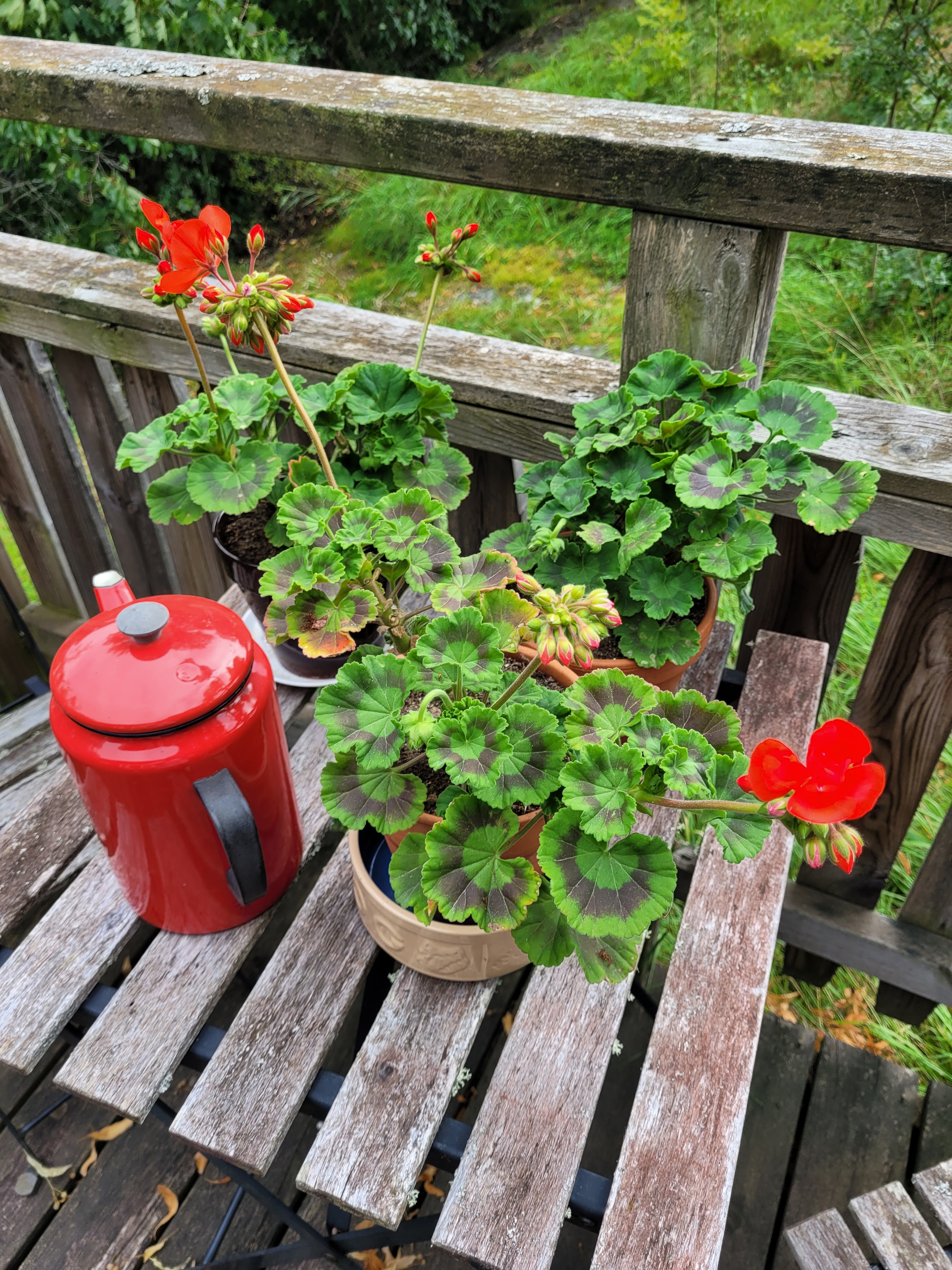 Ut en sväng igen. Kära sonhustru Lotta, ”din” pelargon har en vacker utslagen blomma och elva fina knoppar, har blommat hela sommaren. De billiga röda som jag köpt själv blommar också, men inte lika kraftfullt.