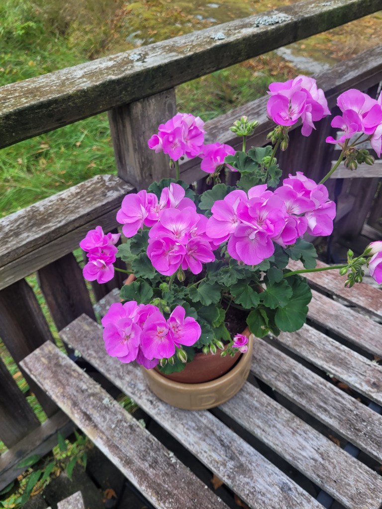 Jag känner mig välsignad, som sitter här i lugn och ro, med besök av en vacker trollslända emellanåt, inte lika välkommen enstaka geting som flög lite väl nära mina fötter. Mina pelargoner prunkar, framför allt den jag fick på Mors dag av sonhustrun. Tack igen, Lotta.