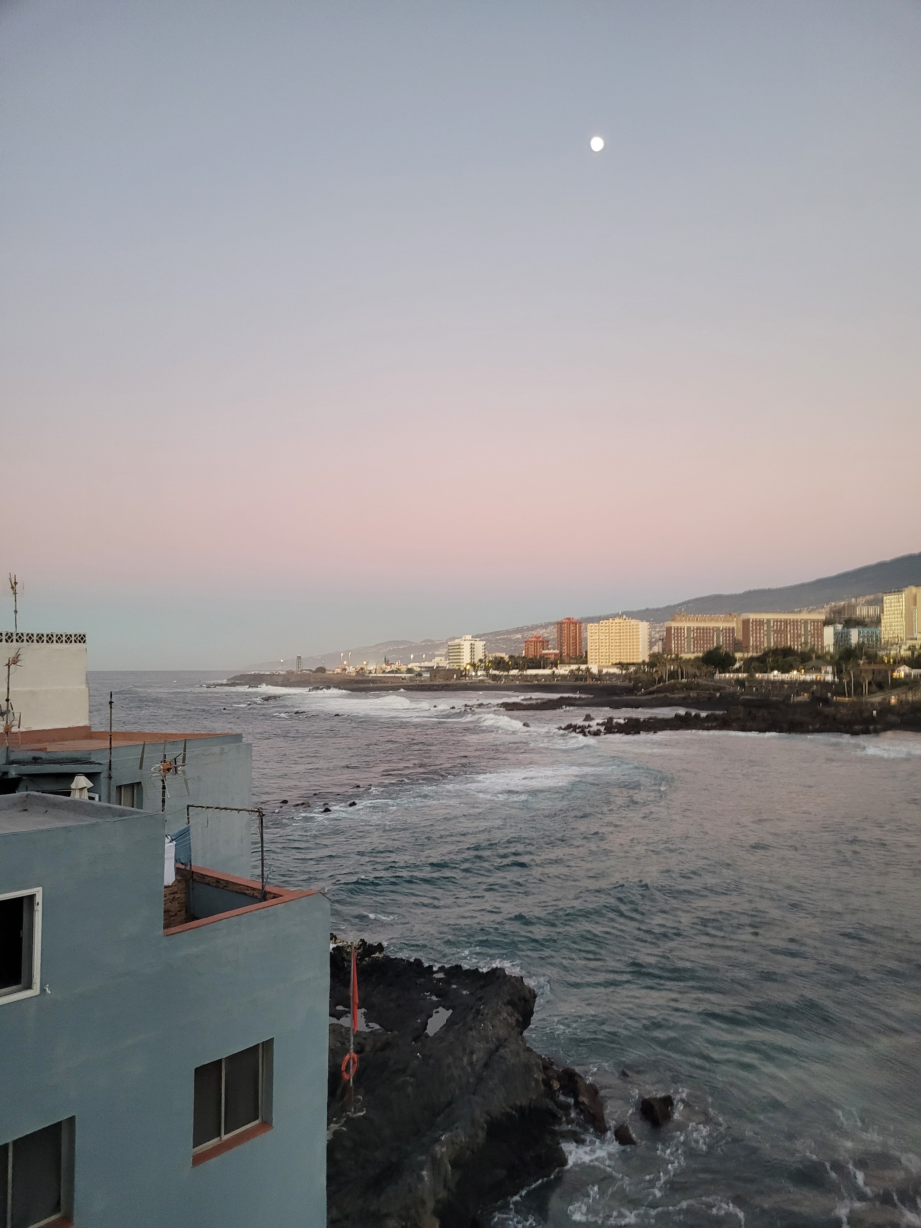 De sista människorna på stranden har gått hemåt, ett par satt länge under terrassen vid restaurangen som aldrig är öppen – nyss gick de därifrån. Inne i Puerto syns ett ganska intensivt ljussken, vet förstås inte var eller varför. Det känns som en lugn lördagskväll, inte mycket trafik, tyst – säger jag som tog ur hörapparaterna det första jag gjorde när jag pratat färdigt med syrran i eftermiddags. Så skönt att inte använda dem när jag inte behöver.