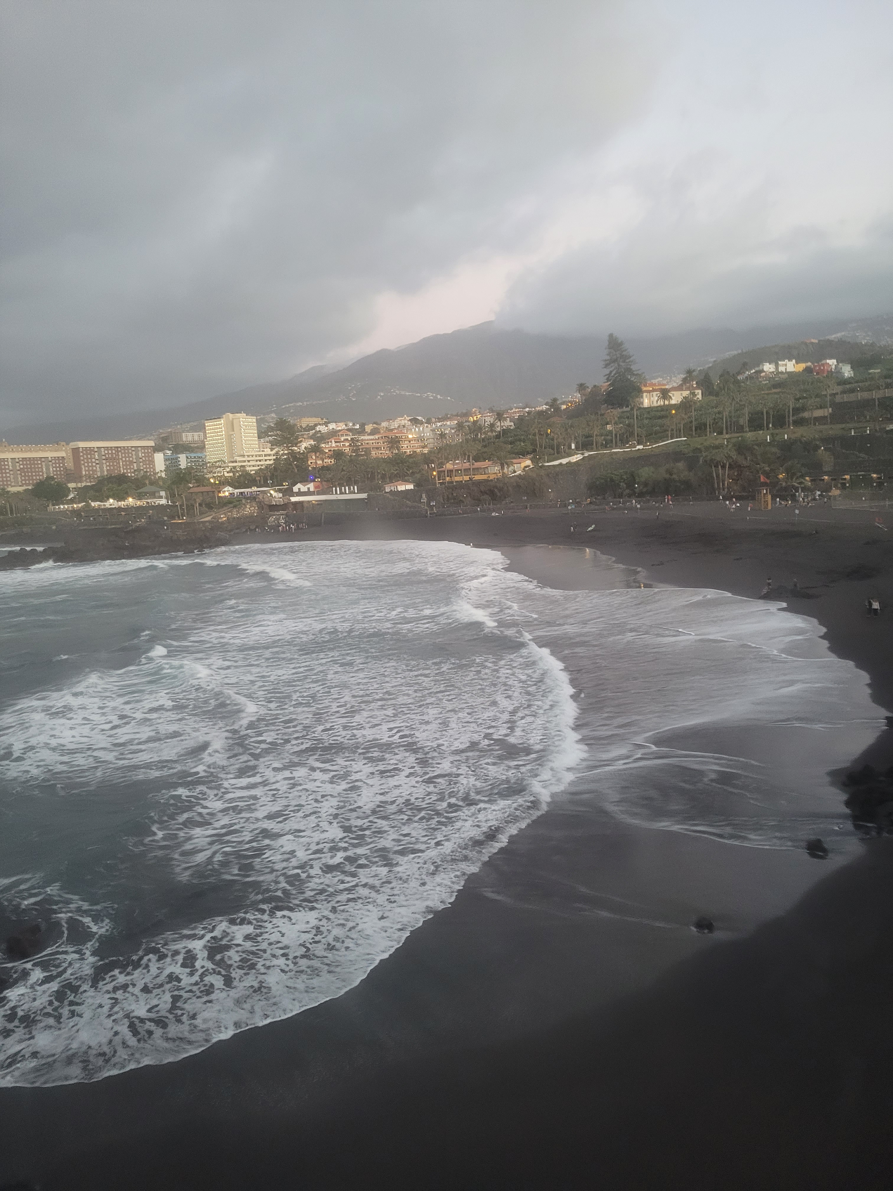 Senare under eftermiddagen jagar vinden fortfarande havet långt upp på stranden. En man badar, duckar under de kraftiga vågorna och försöker hålla sig på fötter. Det går inte så bra. Så låter han en våg bära honom i land, och han springer för att inte nästa våg ska fånga honom. Solen lyser, molnen börjar samlas över bergen och långt borta. Enligt mobilen är luften nu ”måttlig”. I morgon är det den första februari, och jag har en bestämd känsla av att tiden går fortare här än därhemma.