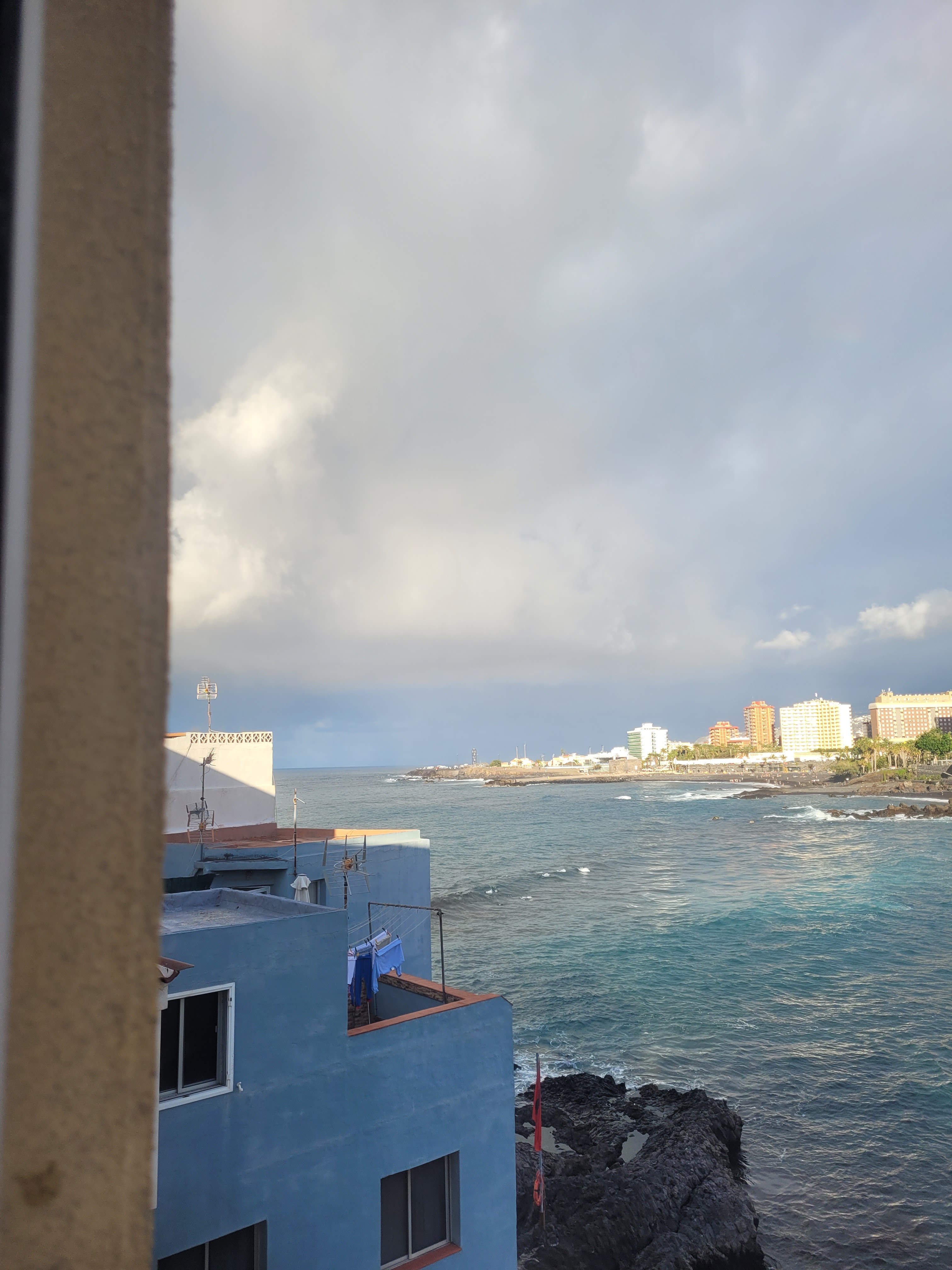 Nu, när klockan är ungefär fem på söndagseftermiddagen, är havet lugnt. Eller i alla fall så lugnt som det blir. Måsfåglar av olika sort flyger omkring. Molnen fyller på upp emot bergen. Solen lyser och det regnar inte. Perfekt ordning här, det mesta av det lilla regn som kommer, faller om natten eller tidiga morgonen.