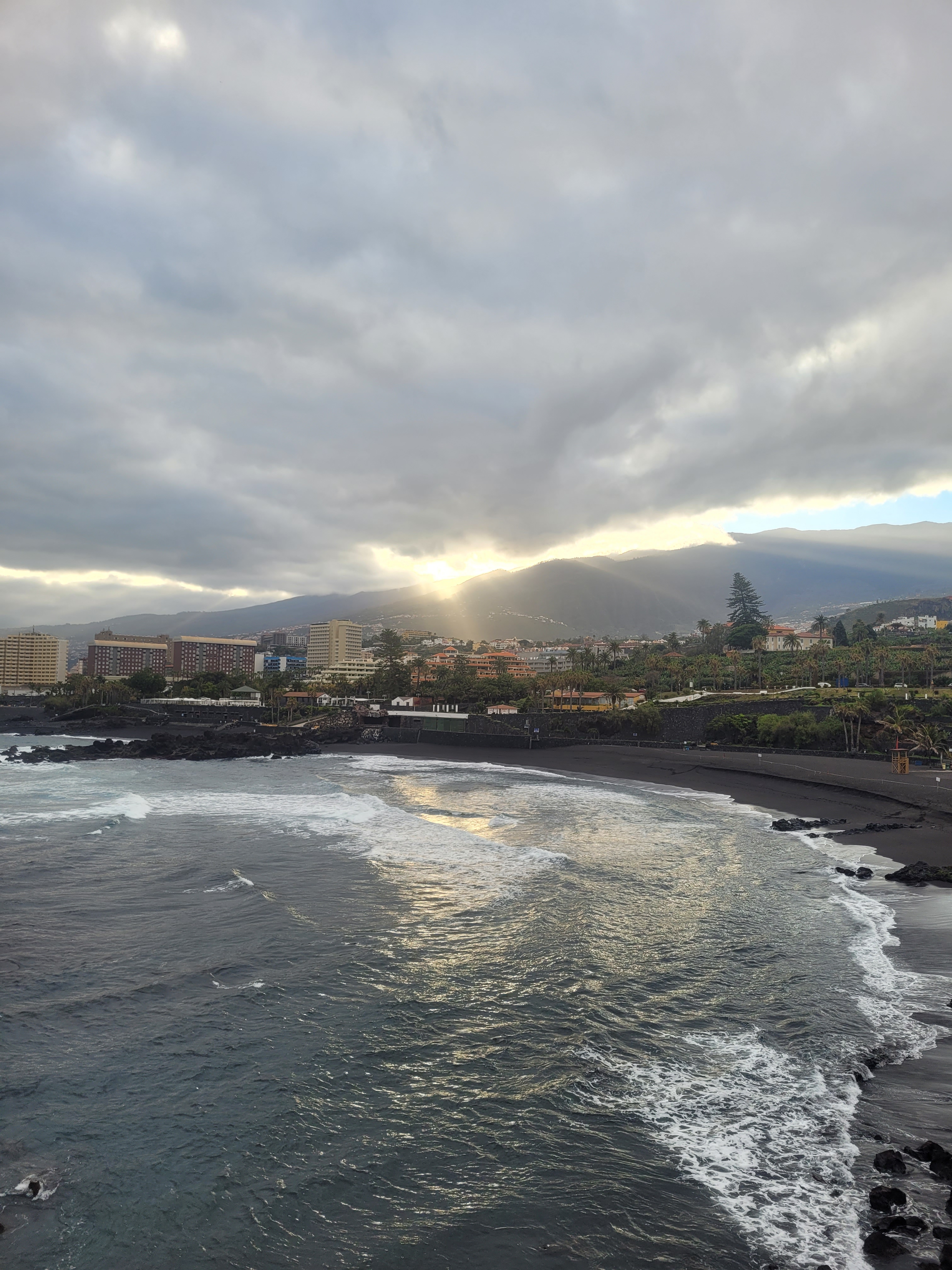 Solen försöker ta sig igenom molnen, i en smal strimma över bergen. Stänger fönstret, lite för svalt.