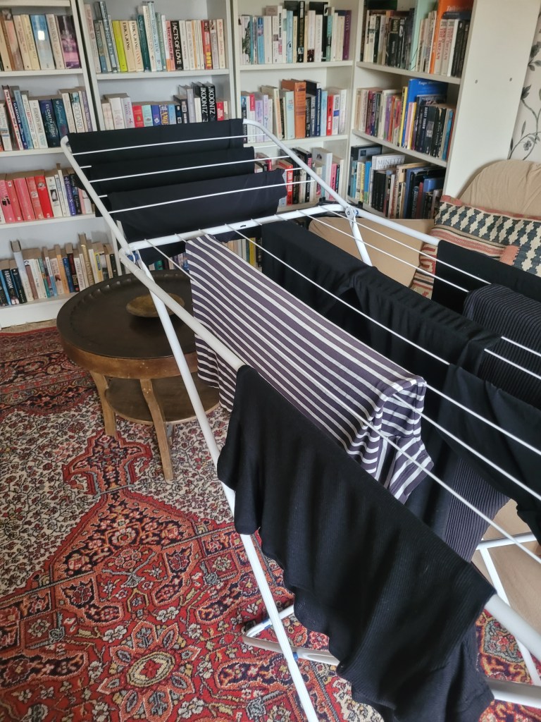 Hänger tvätten på torkställningen i vardagsrummet. Fikar med sista mjölken och sista mandelspånet. I morgon får jag handla igen, åtminstone mjölk.
