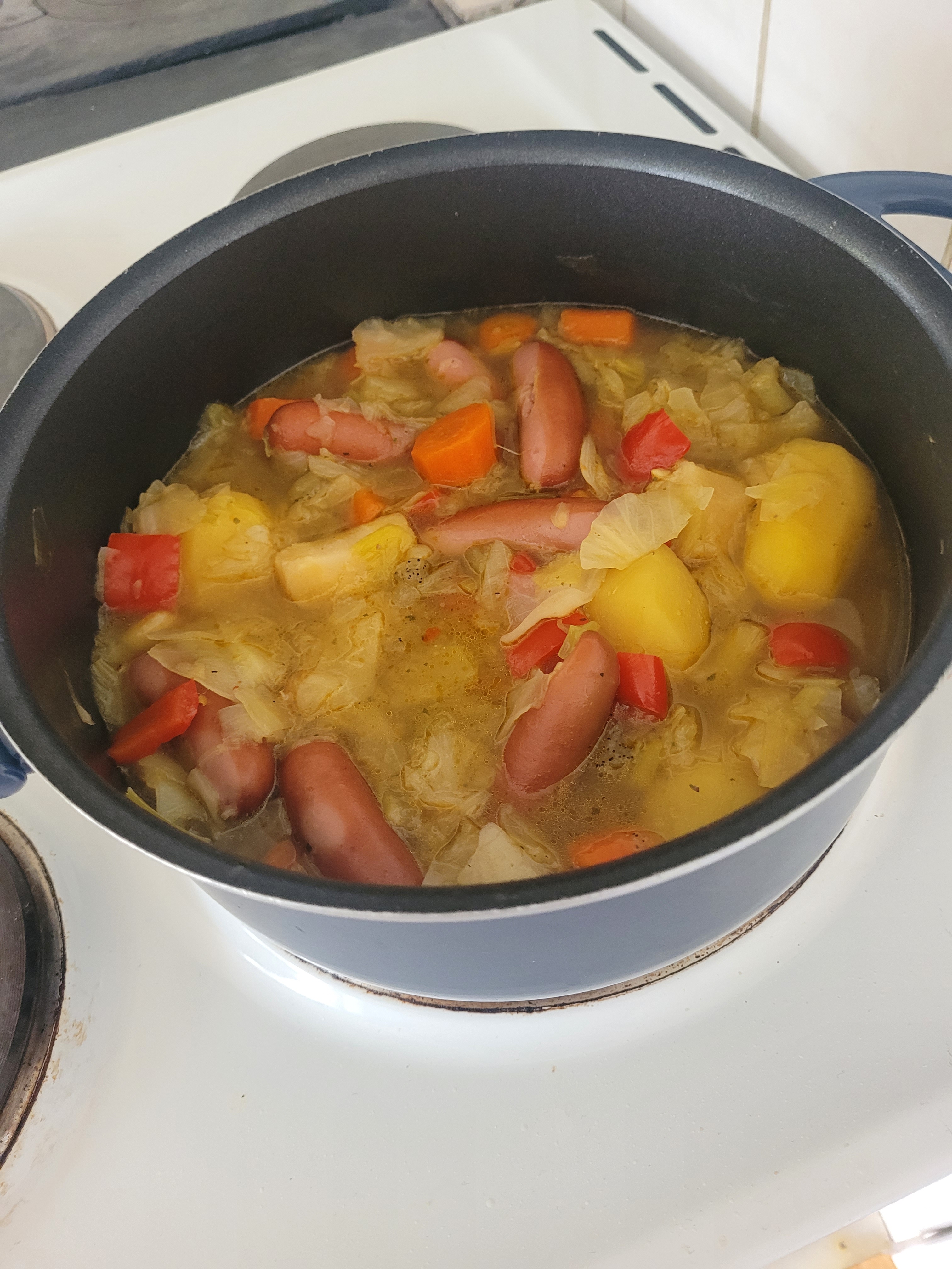 Jag äter min soppagryta, den är god. Och räcker till flera måltider. Den får stanna i kylen, så länge. Om kastrullen får plats.