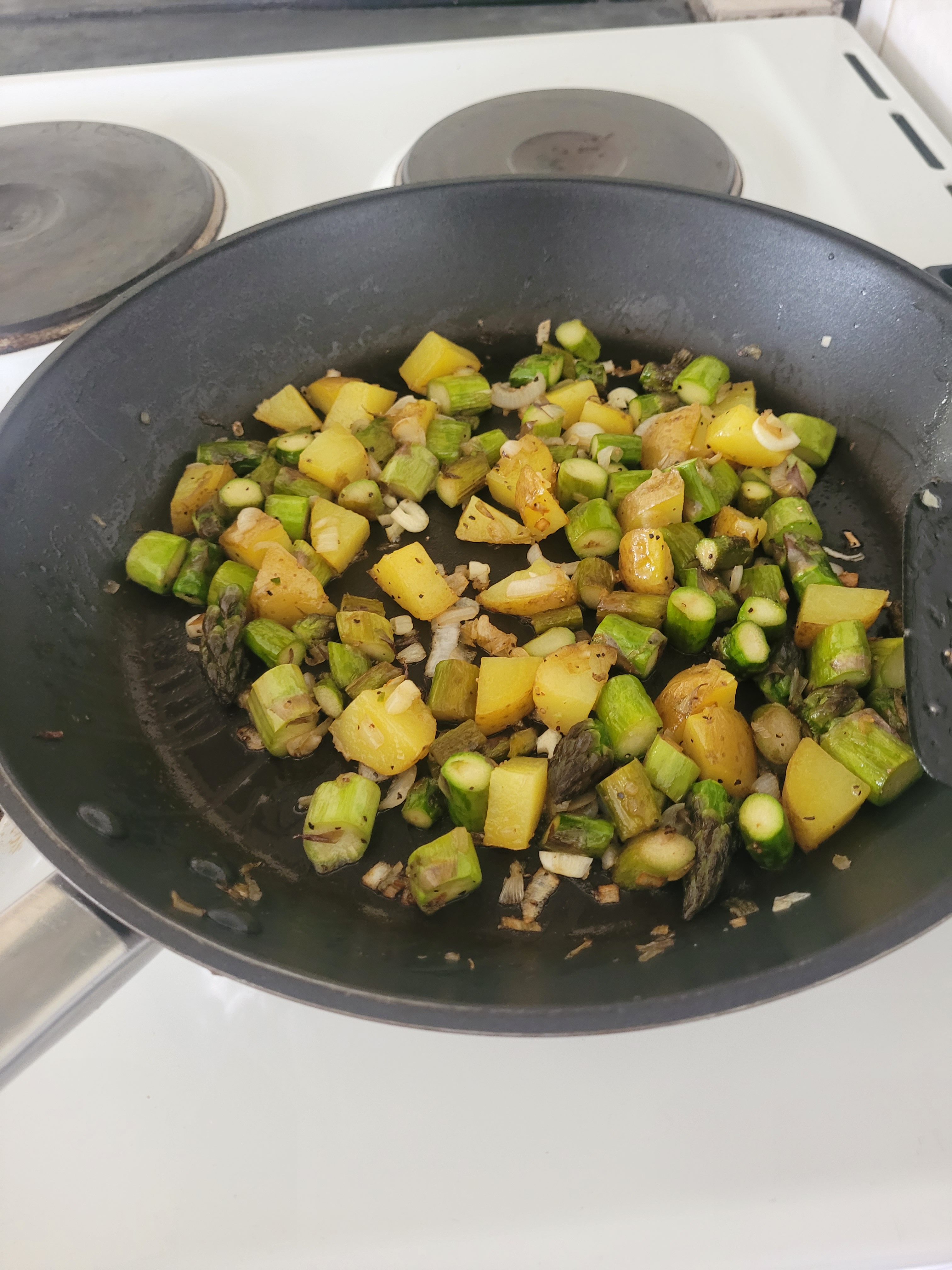 Jag hackar lök, en vitlöksklyfta, sparris och kokt potatis, laxen får vänta i kylen än ett par timmar. Paprikan skär jag inte heller förrän det är dags att äta. Tar fram äggen så de inte är så kylskåpskalla, inte för att jag vet om det spelar någon roll. Steker det som ska stekas försiktigt redan nu, så får det vila i stekpannan tills det är dags för resten.