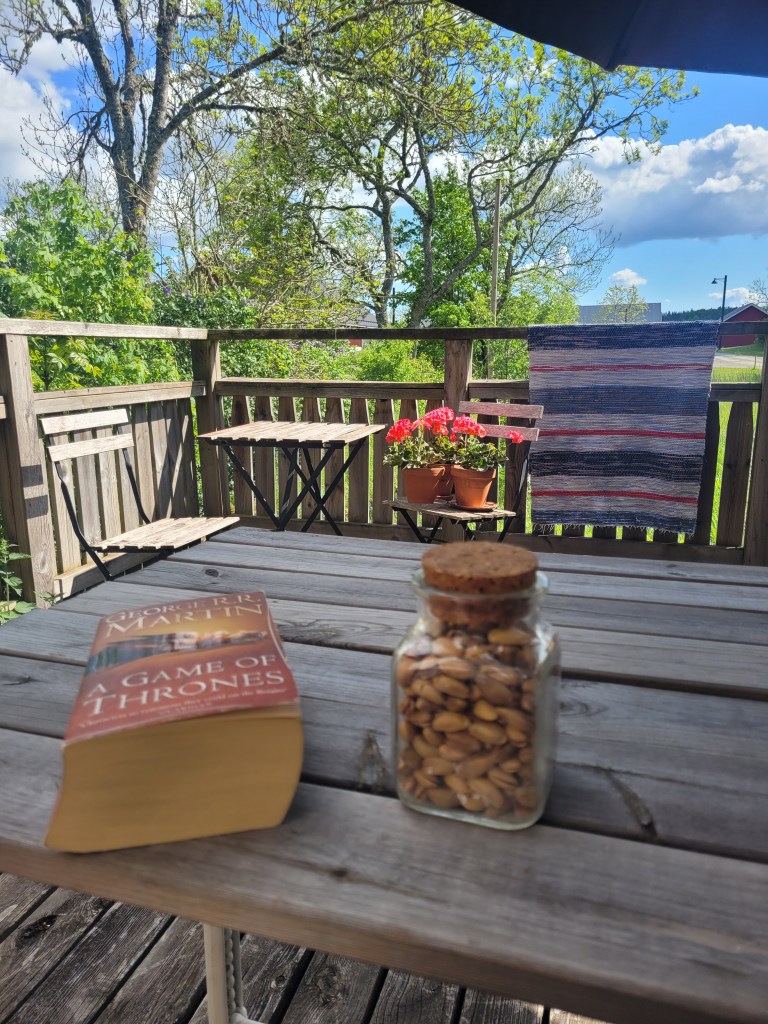 Syrrans gåva, goda pistagenötter, på altanbordet – där bredvid ett vattenglas, och en dry martini. Jans gamla keps ligger och väntar, kanske behöver jag den igen. Och Game of Thrones läser jag i emellanåt. Wordfeudar också emellanåt. Och skriver några ord.
