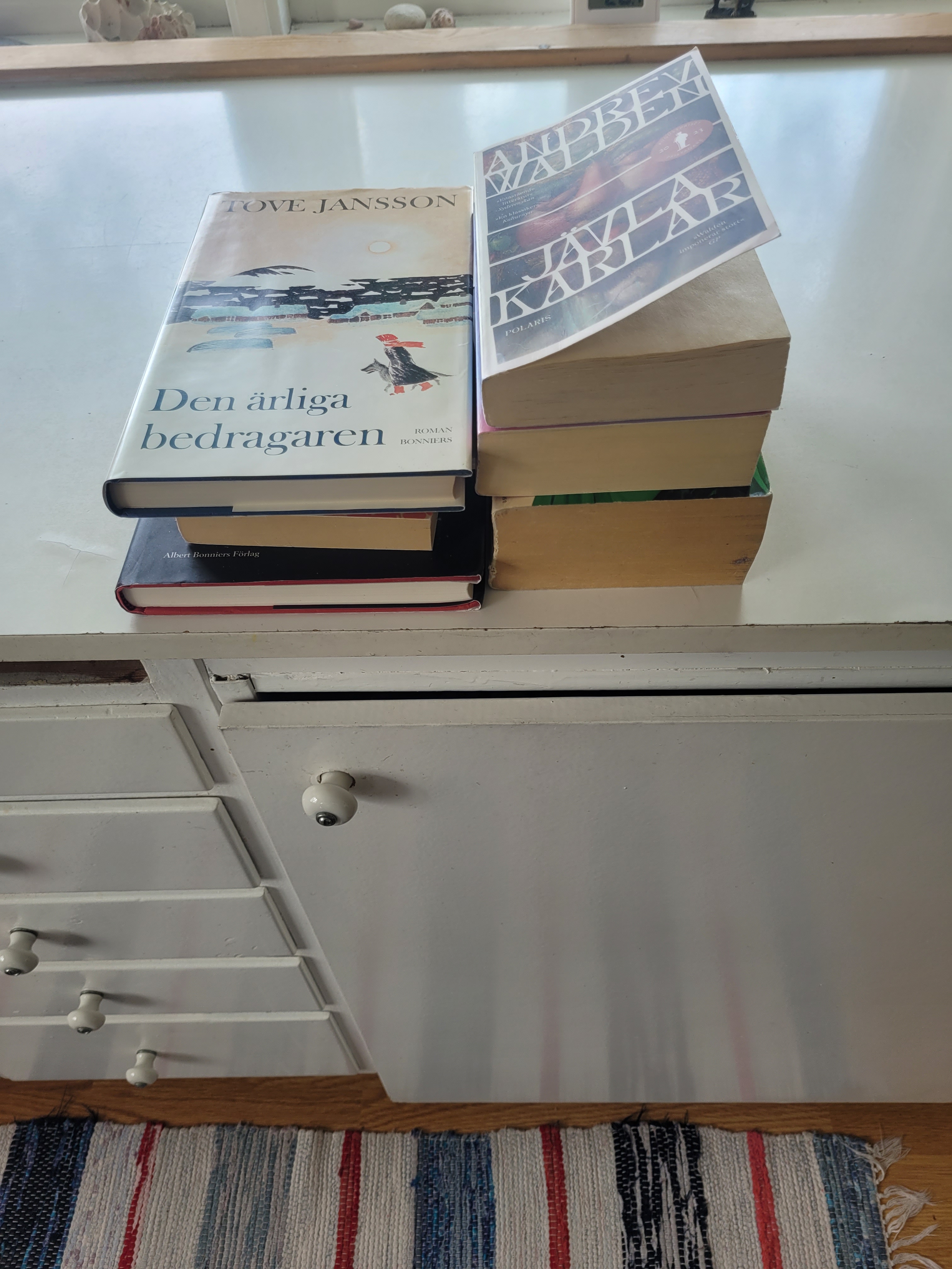 Har en beställning på Bokbörsen, åtta böcker för en och samma frakt, jag får nog betala lite extra. Blandningen av böcker gör mig nyfiken – Mäster Olof (Strindberg), Svinalängorna (Alakoski), A Woman of Substance (Taylor-Bradford), Angels (Keyes), Världen efter kommunismen (Greider), Daghem: förvaringsplats eller barnmiljö? (Ladberg), Jävla karlar (Walden), Den ärliga bedragaren (Tove Jansson). ”Blandu” skulle vi nog säga på dalmål.