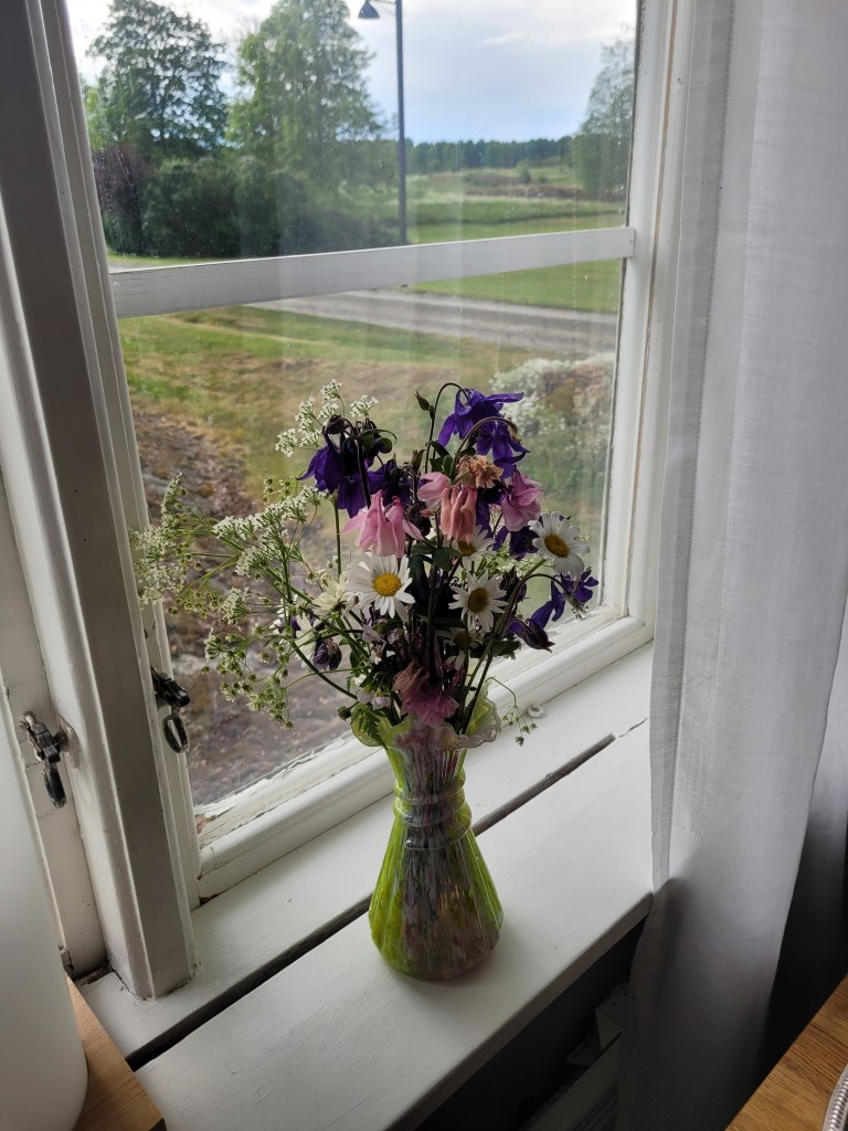 Hittade en rosa akleja idag, övriga är blå. Några små prästkragar där det tidigare funnits många och stora, plus några andra blomster. Buketten är fin i det jag nästan tror är mormors märkligt fula snurriga gulgröna vas – men kanske har jag hittat vasen på någon auktion för länge sedan. Jag lämnade hörapparaterna hemma när jag gick ut – insåg när förvaltaren mycket sakta körde om mig att jag nog bör ha dem även när jag promenerar härhemma. Jag hörde inte bilen, bara förnam den. Och han körde som sagt mycket långsamt, vet att jag är mer eller mindre döv.