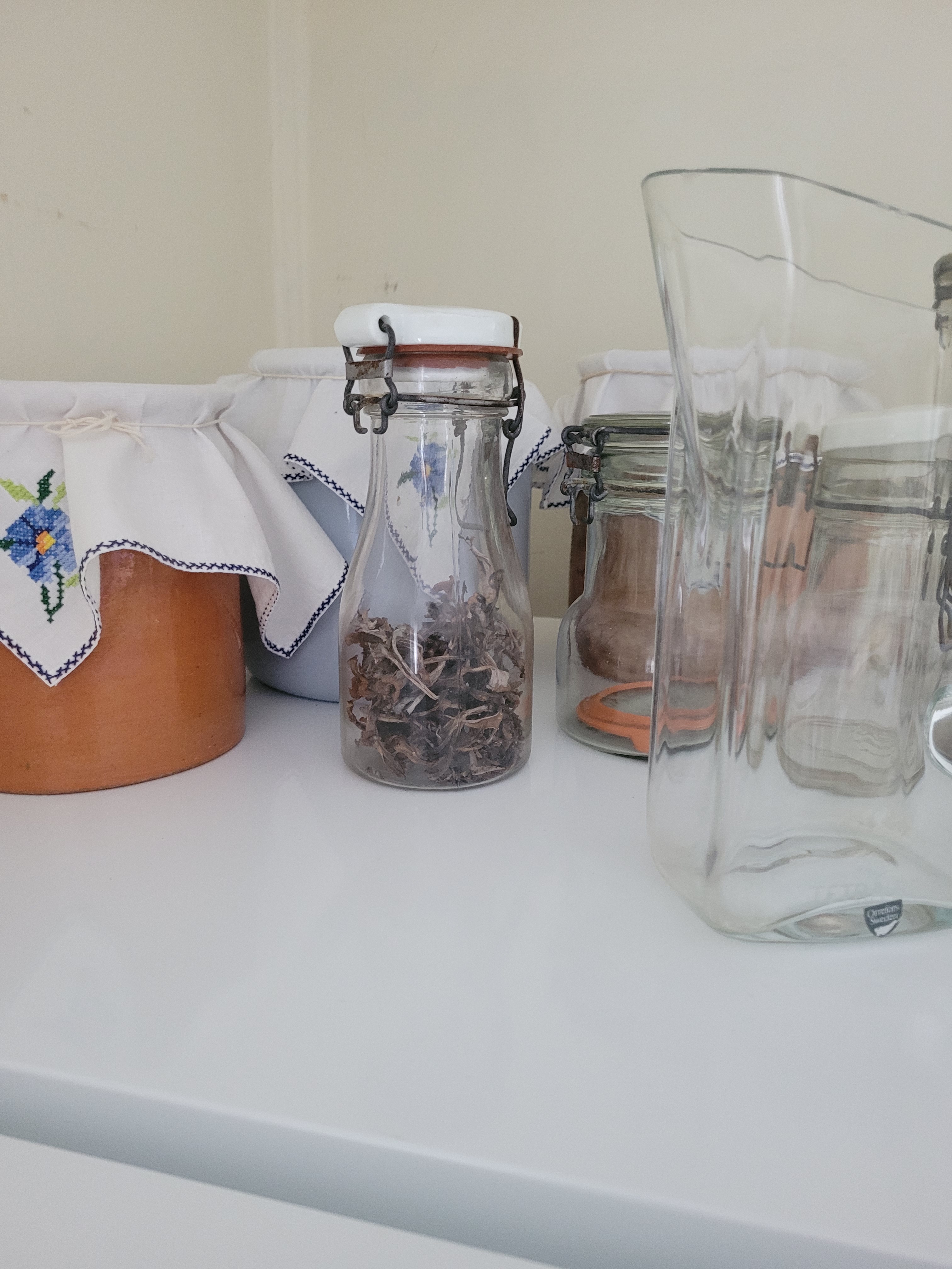 Kommer just på ett annat ”borde”, filtret till fläkten. Lägger det i blöt, i hett vatten och diskmedel. Nu får det vara nog för idag. Brödbaket får vänta. Tar fram smör för att kanske göra korintkakor i morgon. Klockan är två. Det blir mjölkstuvade makaroner på pappas sätt (med riven muskotnöt, det tror jag inte han hade, men en nypa socker till saltet) och en stekt frukostkorv till middag idag, ett par tomater till för syns skull. Men inte riktigt än.