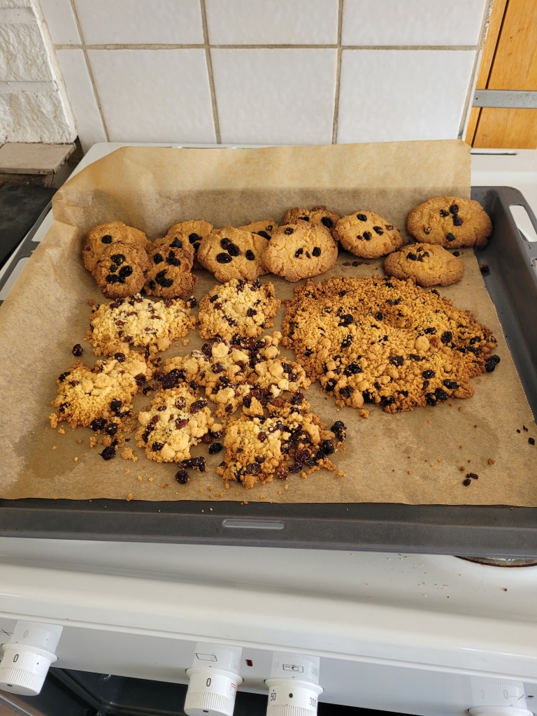 Så skulle jag baka korintkakor, enligt syrrans recept – fick inte ihop degen, den fortsatte vara smulor hur jag än försökte. Slutade med att jag hällde ut en del i form av ”kakor”, en del i större form av ”kaka”. Första plåten blev välgräddad, dessutom. Återstår att se om de är ätbara, syrrans är himmelskt goda. Törs inte ge mig på brödbak enligt andra syrrans recept, det får vänta på att jag blir mera på bakhumör.