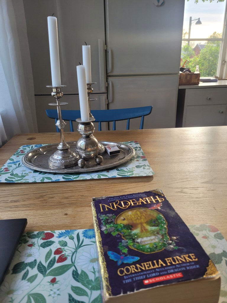 Midsommardagen sitter vi ute på altanen efter frukosten. Skönt, och varierande vind. Anders ritar sina fantasifigurer, Lotta stickar, jag läser och skriver. Har klarat av Wordle och sudoku. Även idag far fyrhjulingar och bilar fram och tillbaka längs vägen utanför huset – gästerna verkar vara kvar i stora huset även idag.