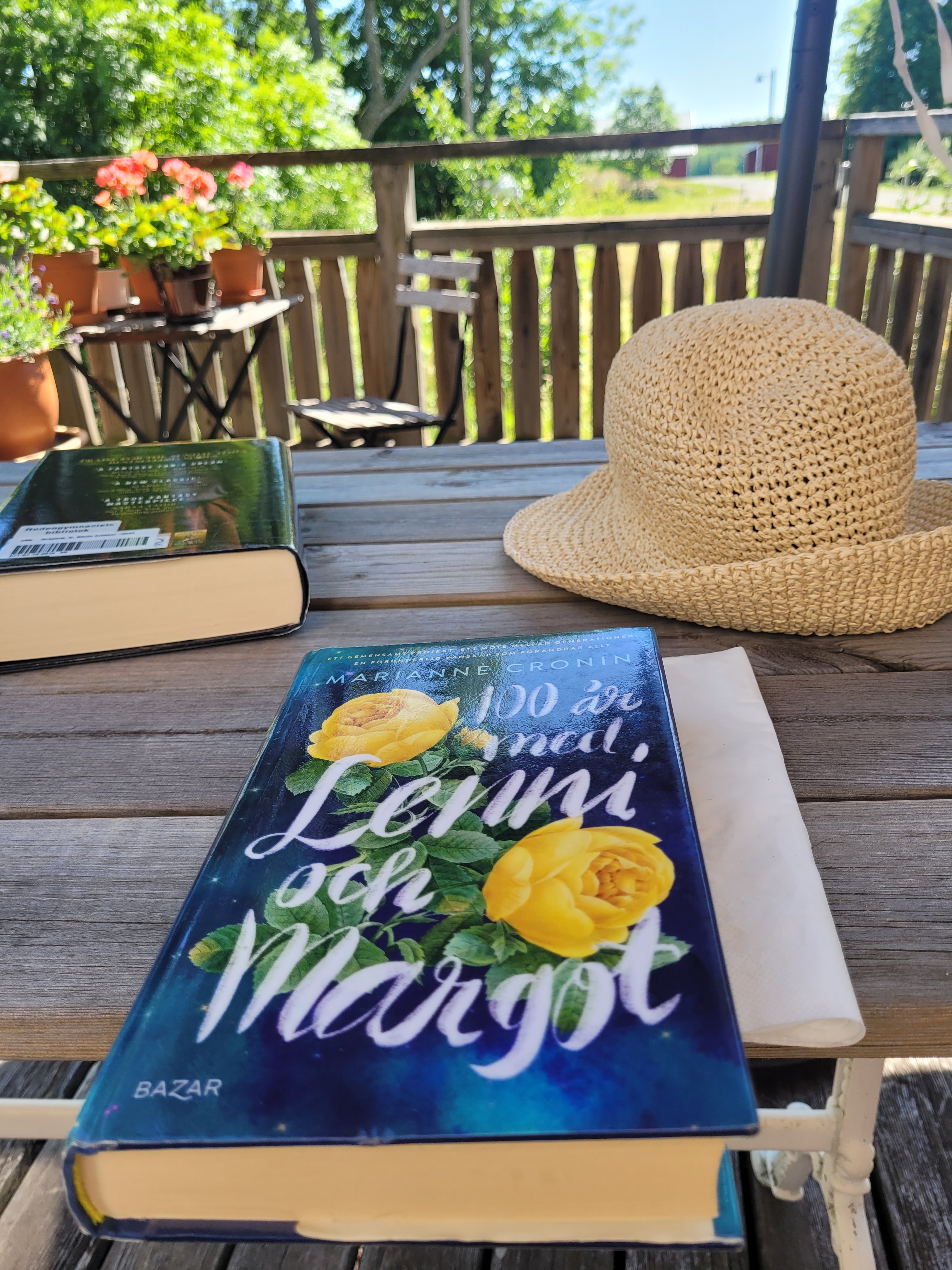 Nu sitter jag i skön skugga under parasollet, och skulle kunna skriva. Om det enda som krävs vore att se vad jag skriver. Tyvärr är mitt skrivande inte så okomplicerat. Jag vet sällan vad som ska komma ner på skärmen. Igår hittade jag en mening som fastnade, i boken 100 år med Lenni och Margot, författare Marianne Cronin. ”Gud är som en kosmisk önskebrunn”. Tyckte det var en passande beskrivning.