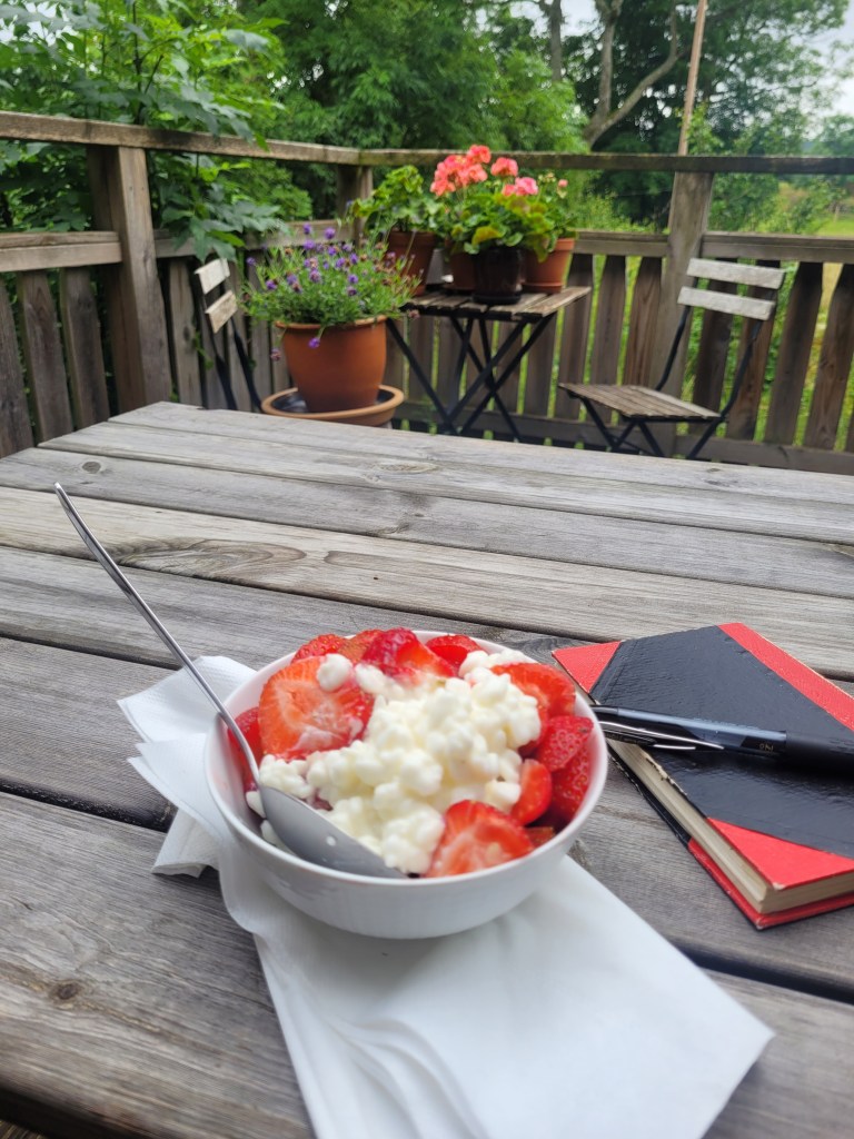 Lunch efter badet – lite Keso och mycket skivade jordgubbar.