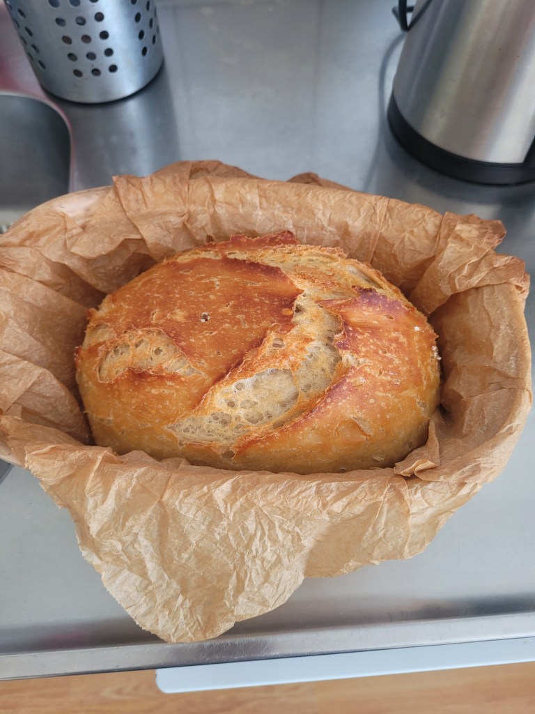 Jag gör deg till grytbröd (400 g/6 ¼ dl vetemjöl, ½ tsk torrjäst, 1 ½ tsk salt, 300 g3 ¼ dl kallt vatten) – grytan har inte använts på länge och krävde ordentlig diskning. Nu ska degen jäsa i stor bunke, täckt med plastfolie, i 12-14 timmar, gärna längre, formas (behöver inte knådas) till ett bröd på mjölat bakbord. Se till att få mjöl runt hela brödet. Lägg på bakplåtspapper och tillbaka i bunken (med papperet) för jäsning igen i ett par timmar. Grytan ska vara förvärmd i ugnen så att den är het, 230 grader i minst en halvtimme. In med det hela i ugnen, locket på, grädda 30 minuter. Ta av locket så att brödet får fin färg, grädda ytterligare 10-15 minuter, innertemperatur 96-98 grader. Låt kallna på galler, vänta med att skära i brödet.
