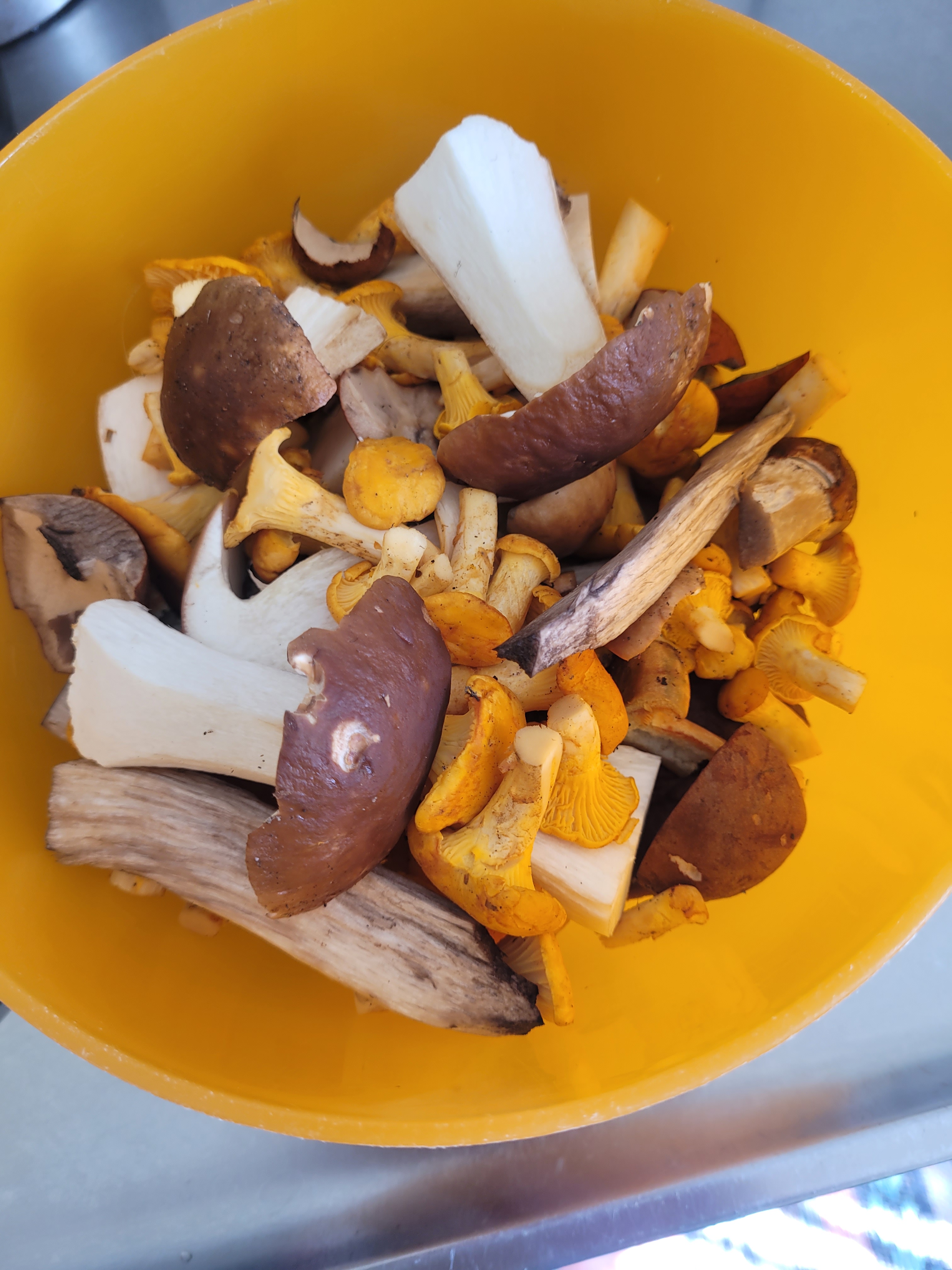 Tar bilen och åker ut mot skogen, stannar lite här och där och plockar svamp. Karl-Johan, små och knubbiga, tegelsopp, liten blodriska, kantareller, små och fina. Har en stav med för stöd när jag måste överkomma diken. En svamptur med minimal gång i skogen, perfekt för mina opålitliga knän. Nu har jag rensat alltsammans och förvällt – sparar en del till helgen då Anders och Lotta kommer hit. Men jag ska äta en del i kväll, tillsammans med stekt potatis, och dito lök. Knaprig bacon vid sidan av.