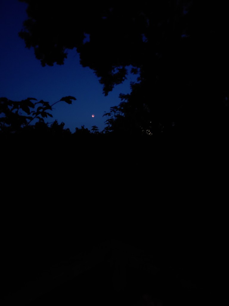 När jag tittar ut en gång till så ser jag den, långt borta. Tar bilder, tror man kan ana sig till den röda tonen. God natt.