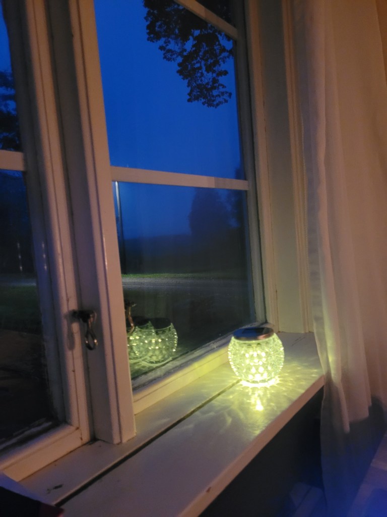 Min lilla solenergilampa lyser i köksfönstret, jag har tänt mina ljus på bordet. Jag finns i en bubbla av mörker, dimma och ljus – långt borta från världens krig och svält. Och jag sörjer att vi som är vuxna/gamla nu, har skapat den värld som är – med de makthungriga framför allt män som krigar som om det skulle göra slut på alla krig.