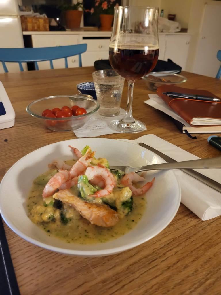 Middagen var god, och jag är mätt. En mörk alkoholfri öl till, IPA, som smakar riktigt bra.