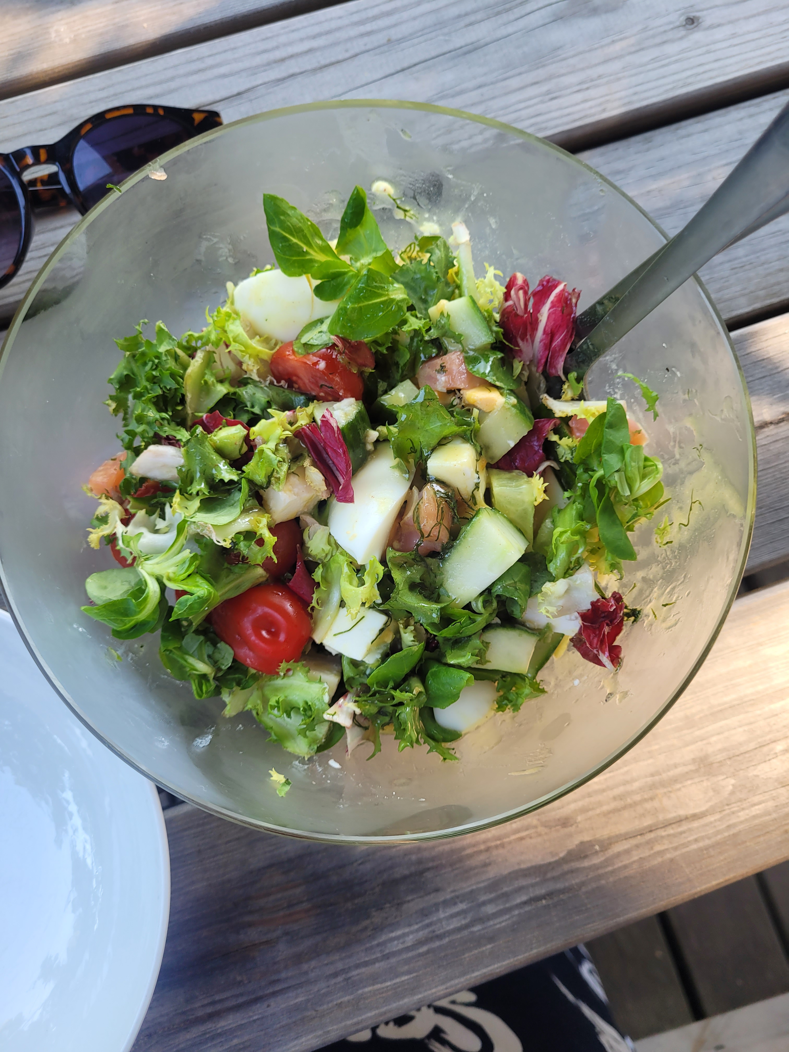 Tisdag vid femtiden på eftermiddagen sitter jag på altanen med min middag framför mig – sallad igen. Jag läser, skriver lite, dricker en Dry Martini i små klunkar som räcker länge. Lägger något ord i wordfeud till min syster som leder, som vanligt. Det är nu verkligen halvklart, molnen täcker himlen – och det är varmt i vinden som ökar. Behöver inget parasoll nu, skugga när solen gömmer sig i moln och träd.