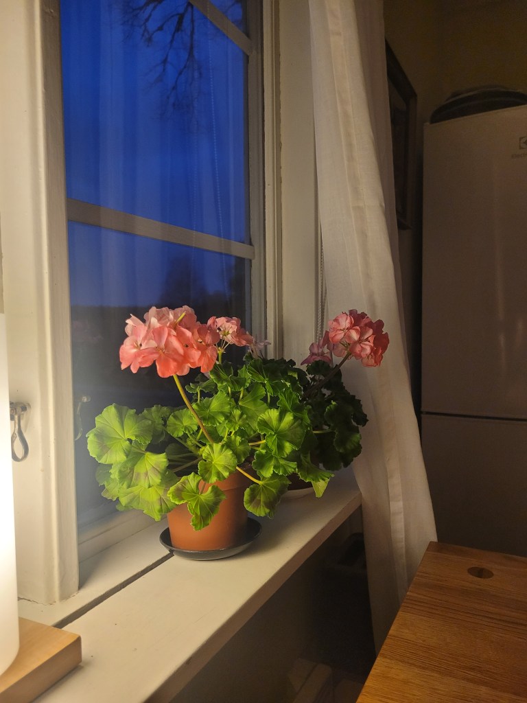 Tagit upp ved från källaren, och flera blomkrukor. Någon dag ska det väl bli varmt nog att plantera om mina pelargoner. Eldar lite i vedspisen även idag, det är svalt i köket. Brödbaket doftar gott. Syrrans döttrar lär ”dra” i degen, inte knåda, när de bakar. Jag gjorde just inte någotdera, degen var ganska kladdig. Det är mycket länge sedan jag bakade. Hoppas jag fortfarande kan känna om bröden är färdiggräddade. Om ett par minuter. De känns lite tunga, får stå fem minuter till. Ska kallna på galler, utan brödduk.