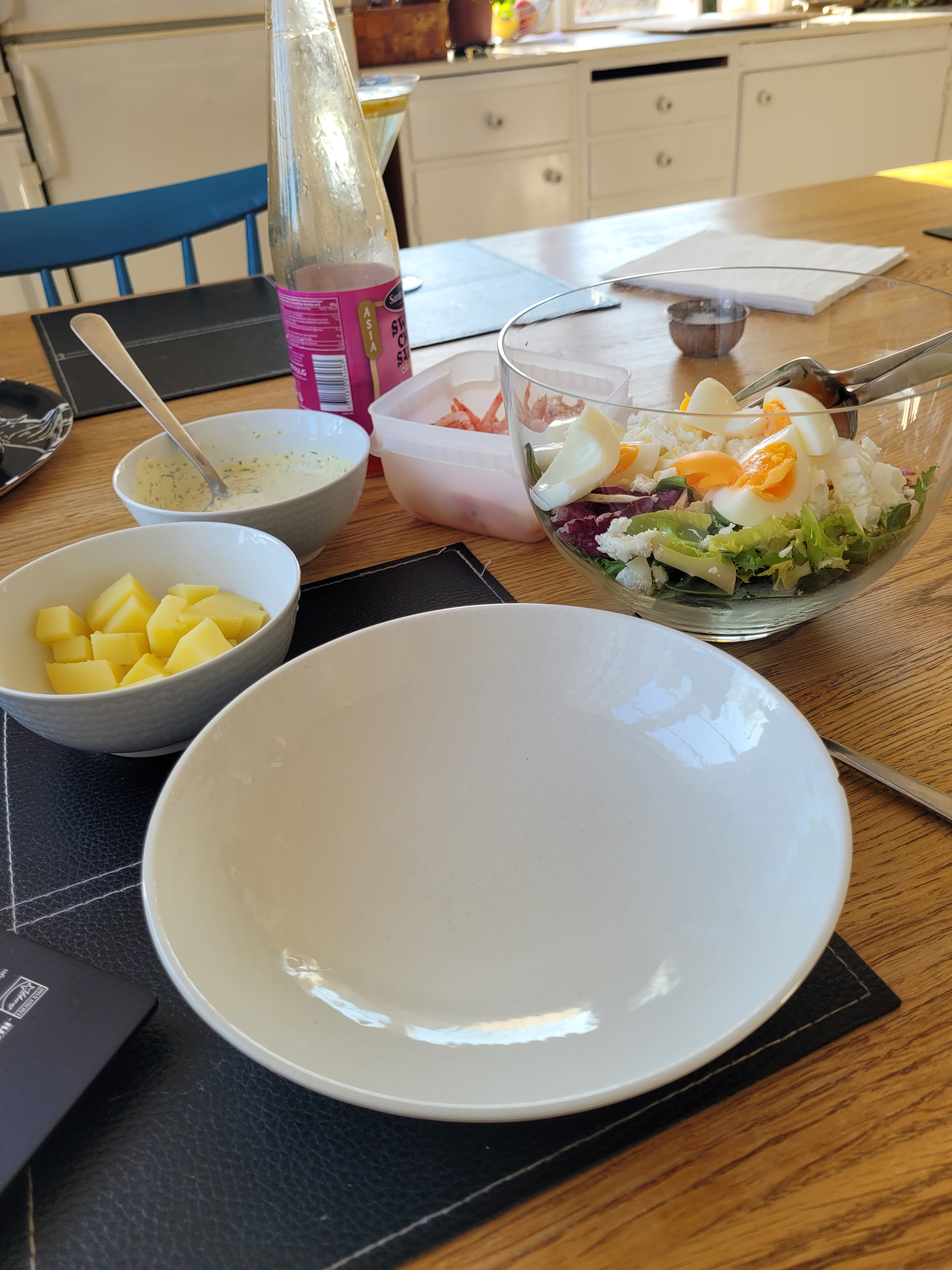 Har hittat boken jag letade efter, och bekräftat beställningen. Stora muminboken à 400 kronor. Gör mig en god sallad till middag, räkor – de sista prisnersatta som Ica hade igår, färska och fortfarande bra – sallad, babyspenat, hårdkokta ägg, sås med crème fraiche, senap och dill – hade ingen majonnäs. En kokt potatis från igår. Lite sweet chilisås. Fetaost. Gott.